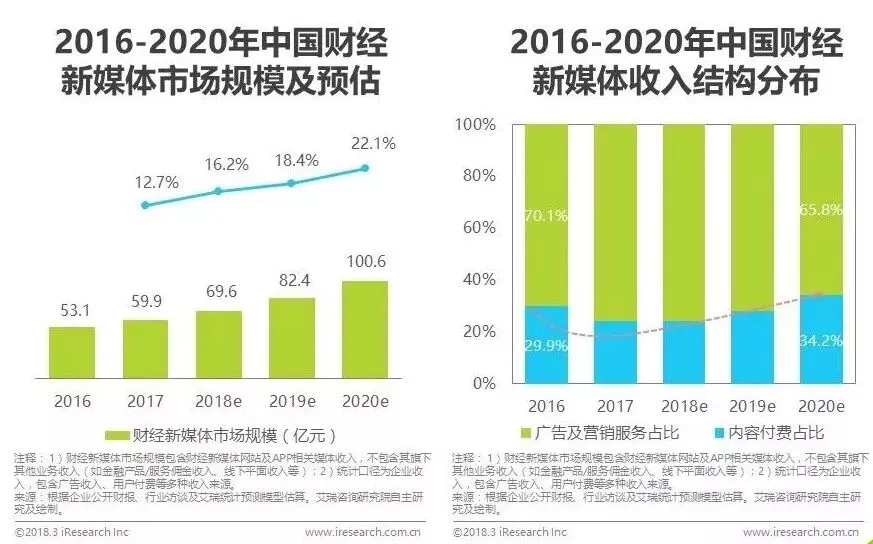 未来伴随着市场复苏和用户为优质内容付费的市场教育程度的提升,财经新媒体平台的用户付费收入规模将不断增长,预计到2020年,其数值将达到34.4亿元,在财经新媒体市场规模中的占比将超过34%。