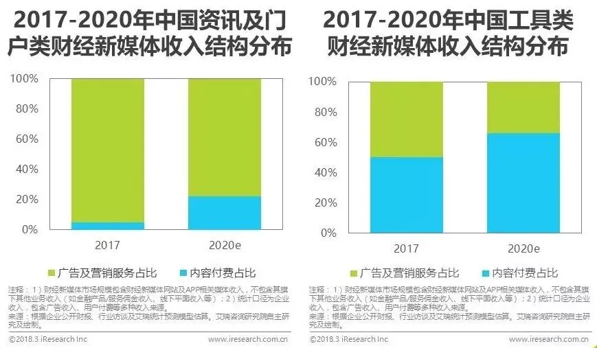 1、2017年财经新媒体市场规模达60亿元,广告业务占比超过70%;预计到2020年,行业规模将达百亿,内容付费业务占比约34%。资讯及门户类平台仍将以广告为支柱,专业服务类平台的营收重心将向内容付费转移;