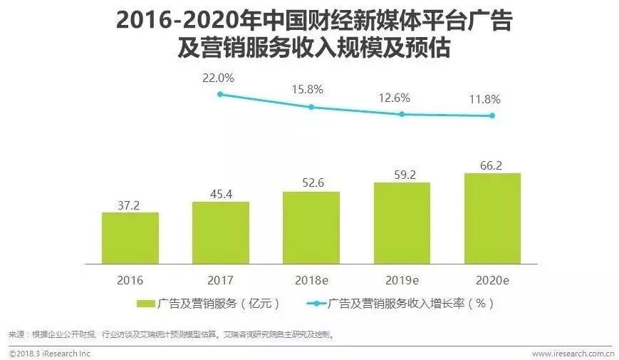 根据艾瑞统计,2017年中国财经新媒体平台广告及营销服务收入规模约为45.4亿元,同比增长22%。一方面,伴随着富媒体内容的崛起,财经新媒体平台也在丰富媒体资源的基础上,探索了包括直播营销、短视频广告在内的多种营销形式,拓展了包括企业上市直播、重大会议直/录播等在内的多元营销服务;另一方面,线上硬广、线上整合营销、线下营销活动等营销类型划分的明朗化,也有利于各类营销服务的精细化运营。