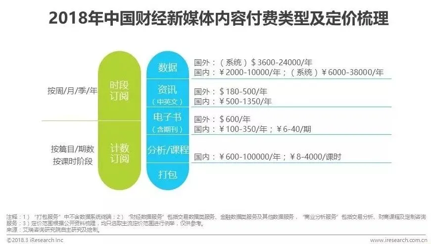 从服务类型来看,目前国内外的财经新媒体内容付费服务主要可以分为时段订阅和计数订阅两大类别,其中计数订阅又包括按篇目/期数计价和按课时阶段计价两种情况。而从内容类型来看,财经新媒体内容付费类型主要包括数据、中英文资讯、电子书及期刊、分析及课程等类别。目前的财经类内容服务整体ARPU值相对较高,其中,除数据系统终端外,商业分析服务中的交易分析服务定价也显著高于其他服务类型。