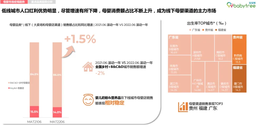 报告显示:低线城市人口红利优势明显,尽管增速有所下降,但母婴消费额占比不断上升,成为线下母婴渠道的主力市场。
