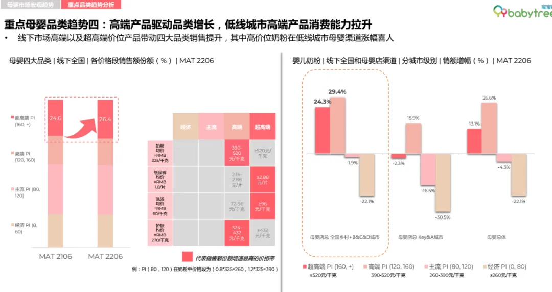 报告显示,高端产品驱动品类增长,低线城市高端产品消费能力拉升。线下市场高端机超高端产品带动四大品类销售提升,其中高价位奶粉在低线城市母婴渠道涨幅喜人。线上奶粉的超高端产品增长明显,高达73.5%;纸尿裤则由高端和超高端驱动增长,增长率为19。4%;线上婴儿浴液、婴儿护肤也有高端化趋势,高端及以上品牌的增长率分别为8.3%和19.6%。