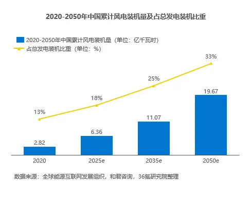 风电因其性能和成本优势,在我国能源转型和新能源体系建设中发挥重要作用。随着风电开发技术水平持续进步,我国风电产业规模将稳步扩大。根据全球能源互联网发展组织和君咨询数据,预计2025年中国累计风电装机量将达6.36亿千瓦时,占全国总发电装机比重18%;预计2050年累计风电装机量达19.67亿千瓦时,占全国总发电装机比重达33%。