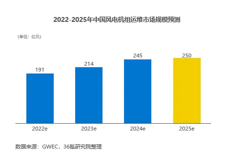 风机运维是海上风电产业的关键一环,通常情况下,风电机组具有2-5年的保修期,在保修期内由机组供应商提供运维服务。当超出保修期后,因设备磨损和可用性下降而引发的运维需求,则成为市场化运维服务范畴。可以预见,随着风电行业快速发展,未来的巨量风电装机容量将给风电运维市场带来巨大潜力。据彭博新能源财经研究报告显示,使用期限接近20年的机组数量正在不断攀升,全球风机换新需求将迎来持续增长;尤其是2024年后,中国风机将再次掀起换新潮。根据GWEC数据,预计2025年中国风电机组运维市场规模将达到250亿元。