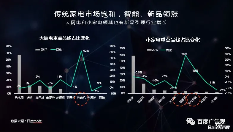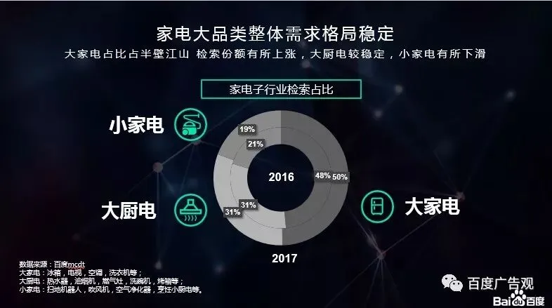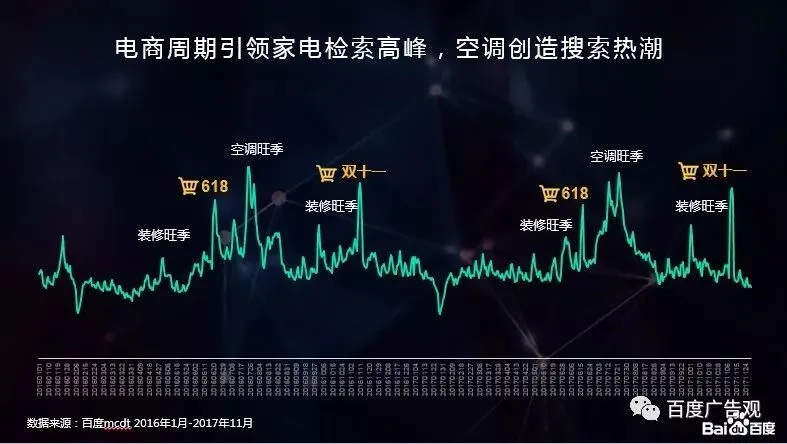从消费者在百度的检索趋势来看,装修季、电商节和单品的旺季会引起家电人群的广泛关注。