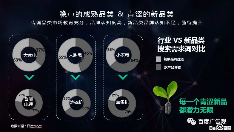新兴品类跟传统家电在品牌成熟度上相比还是比较稚嫩的,大家电和大厨电基本品牌需求都在50%-60%,小家电品类较多,品牌认知度也在40%左右。而我们看到的相对内部高增长的新品的品牌认知度只占20%-30%,每一个新品都像是青涩的萌芽处于待爆发的状态中。