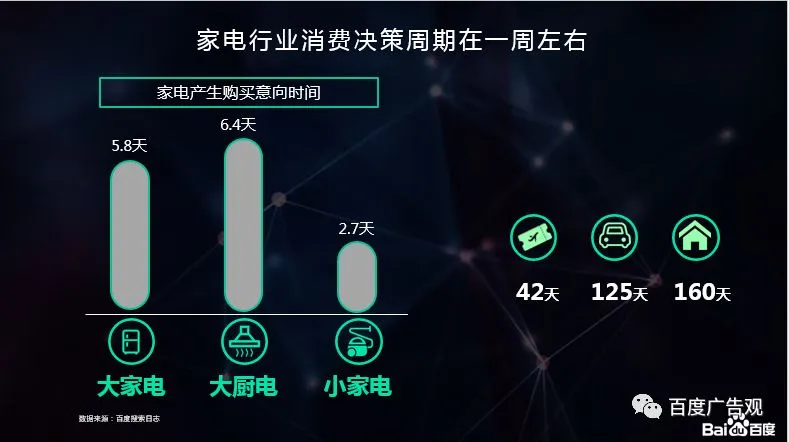 我们的家电消费者决策的路径如此复杂,那么他们是在多长时间内做出决策的呢?大家电和大厨电因为整体需要的使用年限较长,并且还要考虑跟家里的风格是否相匹配所以决策周期相对较长基本在一周左右。而小家电相对价格较低,功能相对较单一且不是强需求产品,大部分消费者都是应激决策,所以决策周期更为简短在3天以内就可以完成购买。但整体而言家电行业的决策周期还是比较短的,旅游行业决策周期有42天,汽车行业决策周期有125天,房产行业高达160天。