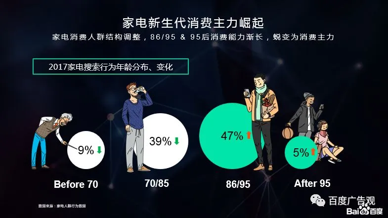 随着85后90后都纷纷步入社会开始工作,他们逐步开始成为行业消费的主力军,在家电行业里86-95年的年轻成占比达到了47%,成为我们主要的消费人群。