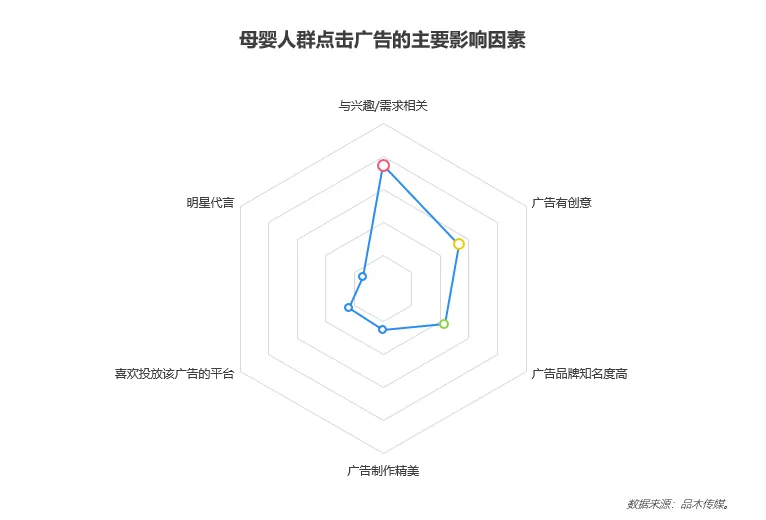 从母婴人群点击广告的主要影响因素看,母婴人群更加容易受到兴趣/需求相关广告的影响,其次是有创意的广告,第三则品牌知名度高的广告。