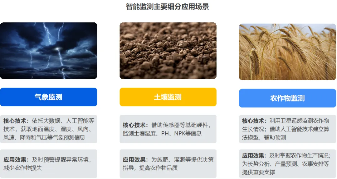 智能监测主要包括气象监测、土壤监控、农作物监测等。