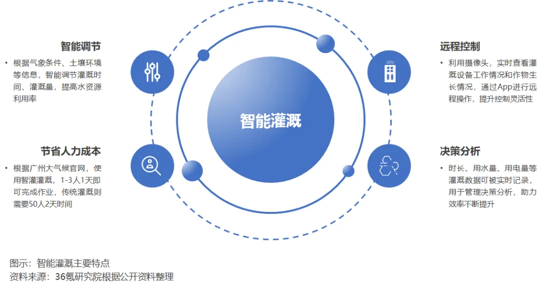 智能灌溉是在依托自动气象站、传感器等监测气象条件、土壤环境等信息基础上,搭建智能灌溉系统,实现灌溉时间、灌溉量的智能调节,以及灌溉设备的统一管理和远程控制。智能灌溉通过精准控制灌溉时间及用量,一方面能够保证作物生长需要的最合适条件,另一方面能够大大提高水资源利用率、节省人力成本,达到增产节能的效果。