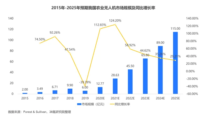 我国作为农业大国,拥有20亿亩基本农田,每年需要大量农业机械进行辅助田间作业。随着无人机在农业领域应用场景拓展,近年来我国农业无人机市场规模呈现快速增长态势。Forest&Sullivan数据显示,2020年-2021年我国农业无人机市场规模增长迅猛,2021年市场规模达到28.63亿元,同比增长率为124.2%。随着农机补贴政策升级和无人机智能化发展应用,我国农业无人机市场有望进一步打开。2022年-2025年,我国农业无人机市场将保持稳定增长,预计2025年市场规模可达115亿元。