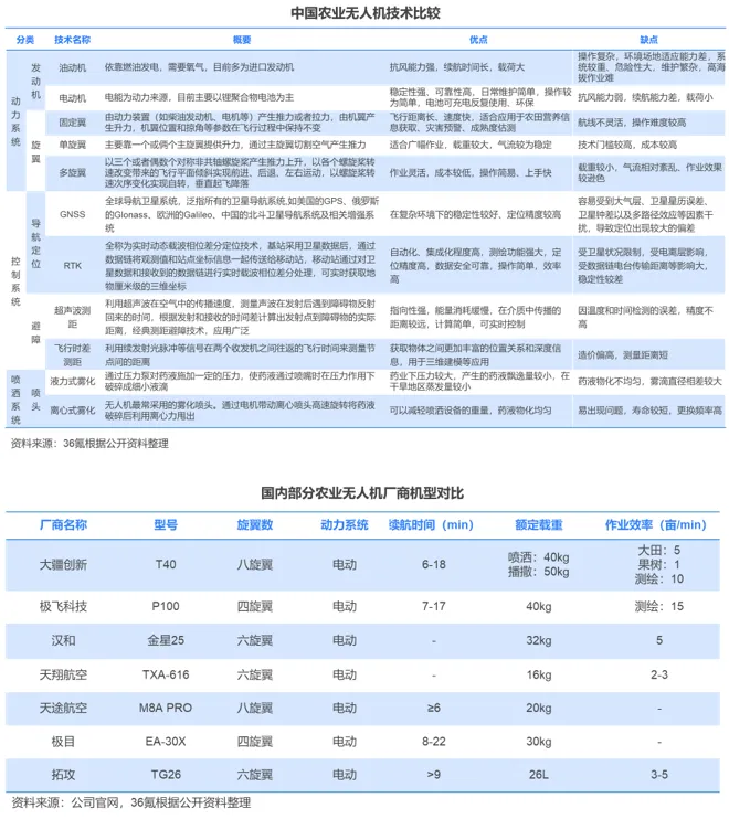 农业无人机硬件配套装备与软件控制系统主要包括动力系统、飞控系统和喷洒/播撒系统等。动力系统为无人机提供动力能源,主要分为油动和电动系统两种类型,其中油动系统多采用进口发动机;电动机具备成本低、稳定性强等优点,是目前市场上的主流产品。当前电池续航多在30分钟以内,随着锂电池技术发展和石墨烯等材料应用,农业无人机续航时间有望提升至1小时以上。飞控系统为无人机整个飞行过程提供控制与决策。在定位与导航上,GNSS导航定位和RTK定位技术成为主流技术;在航向测定上,部分厂商采用双天线或组合导航系统以提高航向精度和抗干扰性。在避障上,常见技术包括RTK技术、超声波测距、单目和双目传感器、微波雷达、飞行时差测距等。国内农业无人机飞控系统产品处于世界领先地位,代表性产品包括极飞科技SUPERX2农业飞控、大疆A2&A3飞控和一飞智控Finix200M等。喷洒系统是无人机中用于喷洒农药防治病虫害的功能系统,其中喷头技术主要分为液力式雾化、离心式雾化2种路线,我国在此基础上研究出旋转式液力雾化、静电液力雾化等多种新型喷头,满足高精准作业场景需求。