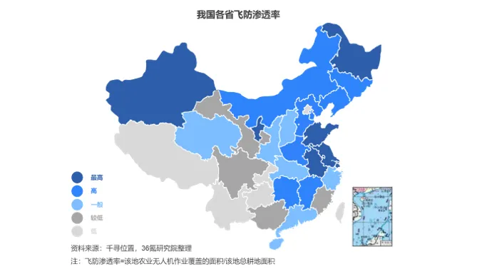 我国地域辽阔、农业自然条件差异极大,导致当前农业无人机区域市场分布不均。土地平坦广阔的黑龙江、新疆等地农业无人机市场普及程度较高,而地势崎岖、地块较小、人口密集地区市场有待进一步开发,未来发展潜力较大。千寻位置数据显示,2021年我国新疆飞防渗透率达到80%,而重庆仅为1%。