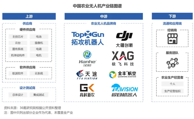产业链结构:由上游软硬件供应商和设计测试商、中游农业无人机品牌商及下游流通和应用端构成