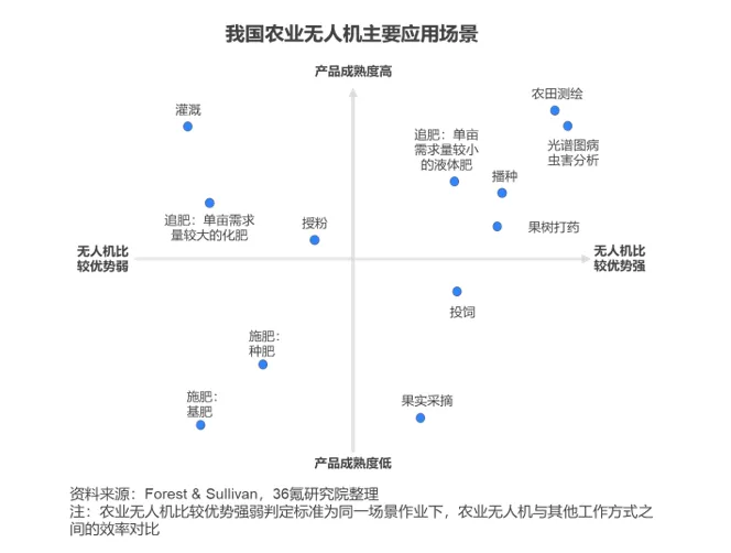 中游为农业无人机品牌商,也是整个产业链的核心环节,整合上游软硬件基础上为下游的用户提供无人机产品、培训、保险、金融、植保等服务。目前市场份额最大的两家厂商为大疆创新与极飞科技。农业无人机整机产品以植保无人机、遥感无人机为主,应用场景集中在植后管理环节的打药作业、农田测绘和虫害分析等方面,无人机播种、追肥、投饲等场景待进一步开发。