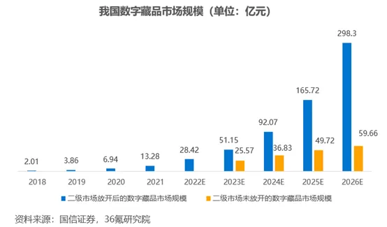 随着数字藏品概念普及率提高,其应用场景将从文娱领域向数字保险、数字教育、数字科研、数字社交等需要明确产权的领域转变,推动数字藏品行业规模不断增长。例如,在科研领域,数字藏品与实验数据、生物样本的结合,可明确信息、数据的来源,提高资源开放性的同时,减少剽窃、数据丢失的风险。此外,目前我国数字藏品二级市场尚未开放,若政策监管有所放开,数字藏品的市场规模将是未开放二级市场的近5倍。根据国信证券数据,2026年,在开放二级市场后,我国数字藏品市场规模将达298.3亿元。
