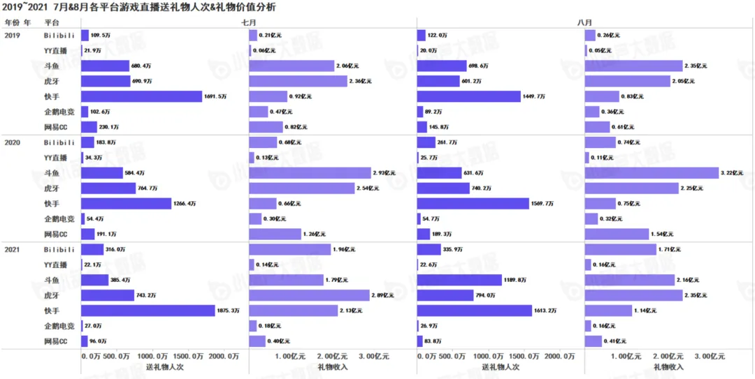 2021年8月,快手直播以1613.2万送礼物总人次遥遥领先于其他直播平台,环比下降13.98%,同比增长2.78%,快手直播人气最高;虎牙直播以2.35亿元总礼物收入高于其他直播平台,虎牙直播吸金能力最强;快手直播在此期间礼物收入降幅最大,8月B站送礼物人次335.9万,礼物价值1.71亿元,从2019年至今B站稳步增长;8月B站人均送礼价值达50.89元,远超其他平台;斗鱼平台送礼人次1613.2万远超其他平台。