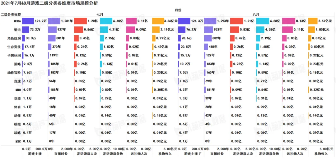 目前二级游戏类型分布情况中,MOBA、射击、角色扮演这三类游戏,是领先其他游戏的,其中特别是MOBA类游戏,2021年8月124.3万人,环比增长2.6%;直播时长维度,MOBA类直播时长1293年,平均一个主播每天直播9.1小时;2021年8月礼物价值2.57亿元,环比增长15%,发送弹幕条数6.40亿,环比下降23.5%,主要是部门地区学校8月学生开学,观看群体减少;从平均每人送礼物价值来看,角色扮演平均每人礼物价值17.4元;MOBA类平均每人礼物价值19.8元;MMO类游戏平均礼物价值达32元,表明MMO类直播吸金能力强。