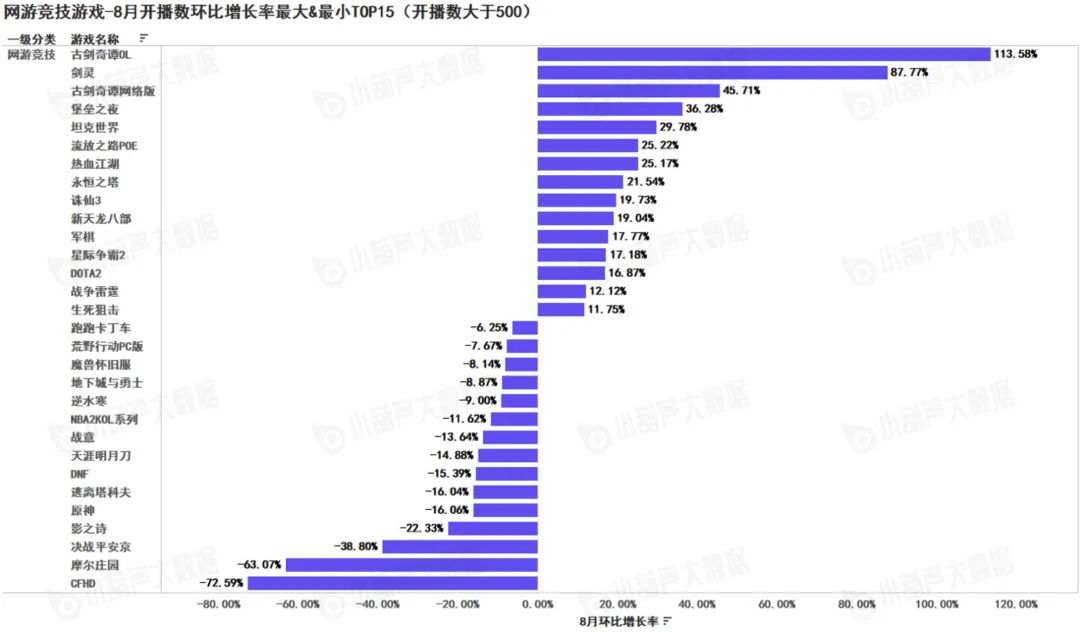 网游竞技篇TOP15:《古剑奇谭OL》8月开播数环比增长113.58%