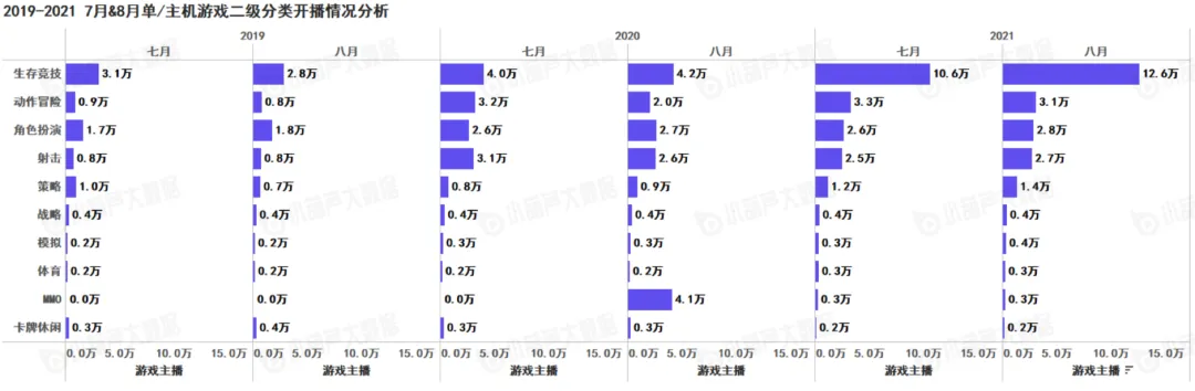 从数据上看最近3年以来,单机/主机游戏中热门游戏类型较为固定,生存竞技类,动作冒险类,角色扮演类和射击类游戏一直很受主播青睐。2021年8月,生存竞技类开播数为12.6万,同比增长200%,造成此现象的最关键因素是《永劫无间》的爆火。