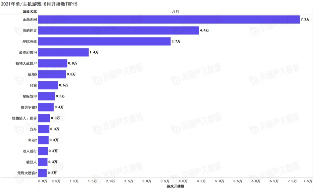《永劫无间》自7月8日国服不删档测试以来,8月开播热度持续走高,8月开播数为7.2万,卫冕了单机/主机游戏中的NO.1。因为7月份的版本更新,《我的世界》也跻身前列;8月4日,《APEX英雄》第十赛季开启,顺势进入TOP3。
