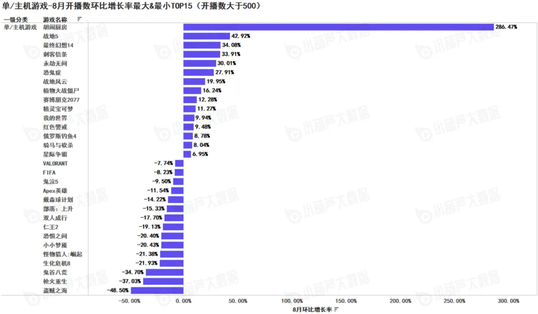 单机/主机游戏篇TOP15:《胡闹厨房》8月开播数环比增幅最大