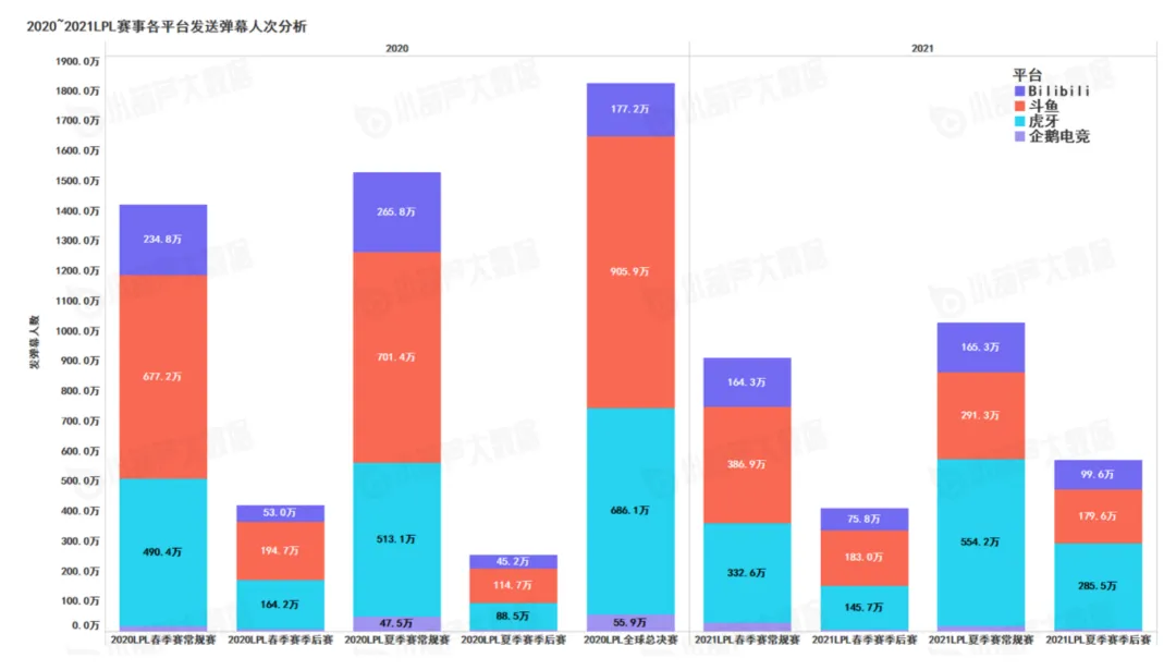 2021年各阶段LPL赛事虎牙发送弹幕人次反超斗鱼平台,虎牙2021LPL夏季赛季后赛同比增长222.6%