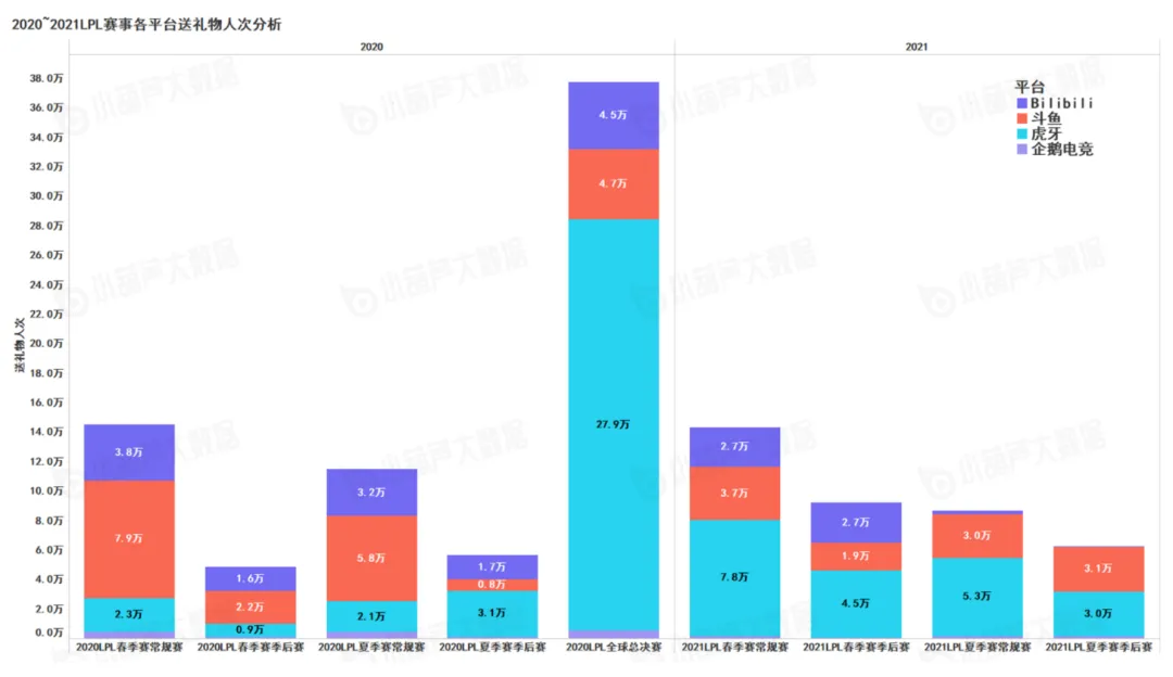 LPL赛事各平台送礼物人次,主要集中在虎牙、斗鱼、B站这3个平台,2021年LPL春季赛常规赛虎牙平台送礼物人次达7.8万人次,同比增长239%,而2020年春季常规赛斗鱼平台高于虎牙平台,可看出斗鱼平台有一部观众注入到虎牙平台;2021年个平台整体送礼物人次主要集中在虎牙平台。值得一提的是,全球总决赛期间,虎牙直播送礼物爆发式增长。