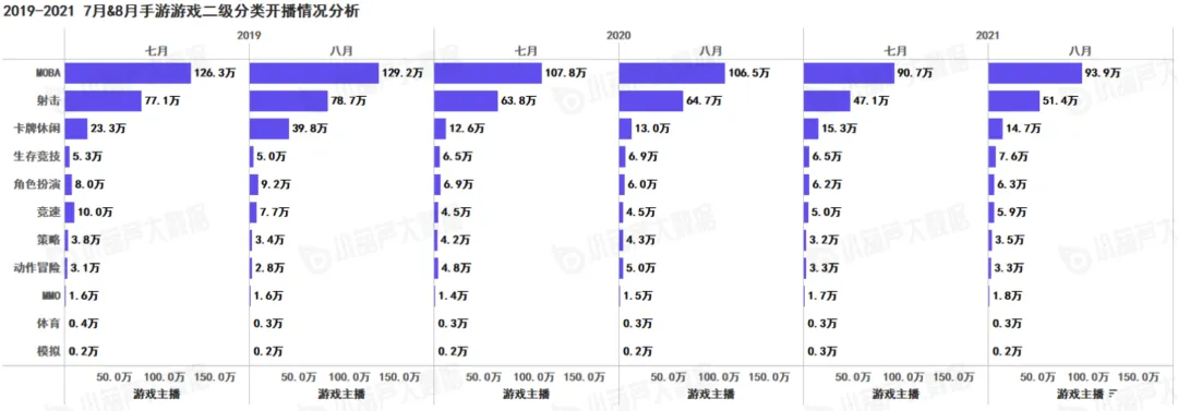 2021年8月,游戏直播市场中直播体量最大的3大游戏分类依次是MOBA类,射击类和角色扮演类游戏。其中,MOBA类游戏8月开播数30.4万,环比下降0.33%,射击类游戏8月开播数为22.1万,环比下降5.96%,角色扮演类游戏8月开播数为19.4万,环比下降9.77%,三大品类8月开播数均小幅下跌;但是同比仅角色扮演类有显著提升,这很大程度上可归因于《原神》的贡献(《原神》国服公测于2020年9月末)。