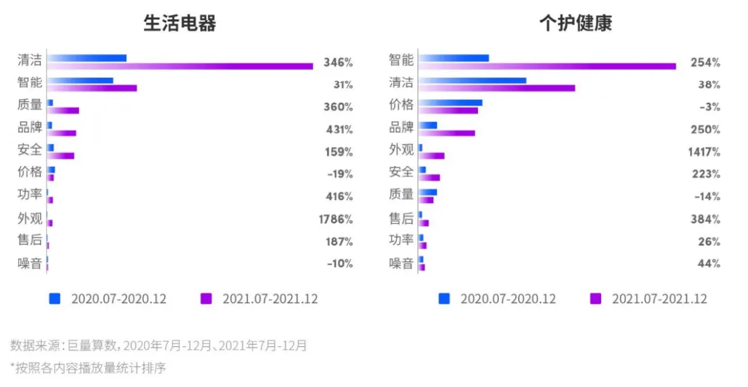 小家电品类中,生活电器头部品牌的稳定性出乎意料。其根本原因是扫地机器人、洗地机等清洁电器的爆火,导致其它品类相关品牌的表现对整体声量影响不大。