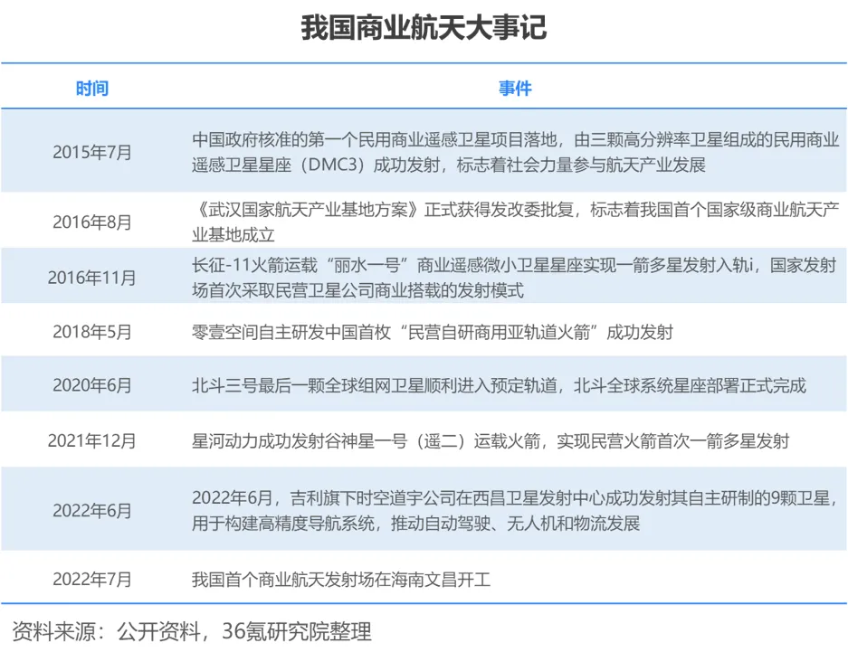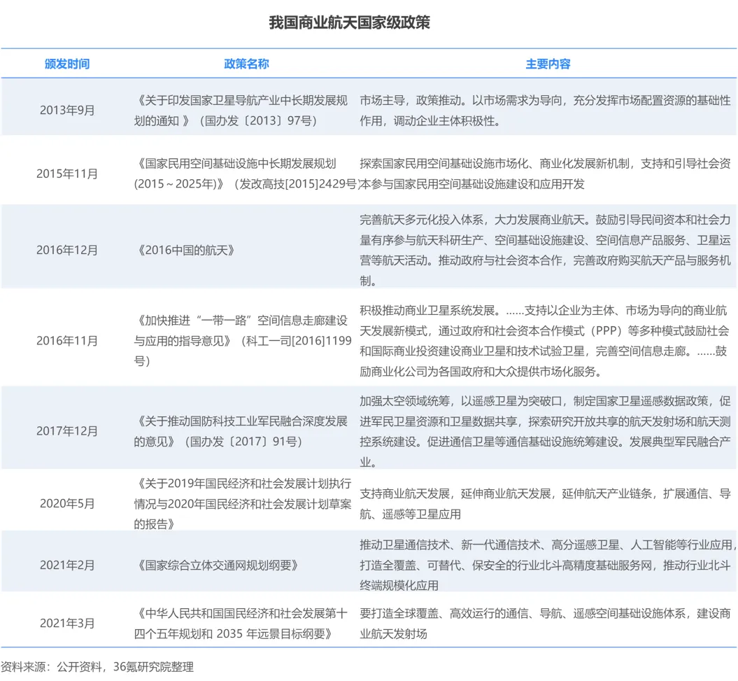 我国持续颁布政策措施促进航天商业化,推动民间资本与社会力量进入航天领域,发挥市场在航天领域中的资源配置作用。国务院办公厅于2013年发布的《关于印发国家卫星导航产业中长期发展规划的通知》(国办发〔2013〕97号),提出充分发挥市场在卫星导航产业中的资源配置作用。2016年,国务院新闻办公室发布的《2016中国的航天》白皮书,提出鼓励引导民间资本和社会力量有序参与航天科研生产、空间基础设施建设、空间信息产品服务、卫星运营等航天活动。随着“一带一路”建设的推进,商业航天成为推动提升空间信息覆盖能力的重要手段。《加快推进“一带一路”空间信息走廊建设与应用的指导意见》(科工一司[2016]1199号),提出了以PPP等多种模式鼓励商业航天产业发展。2021年3月,《中华人民共和国国民经济和社会发展第十四个五年规划和 2035 年远景目标纲要》,强调打造全球覆盖、高效运行的通信、导航、遥感空间基础设施体系,建设商业航天发射场。