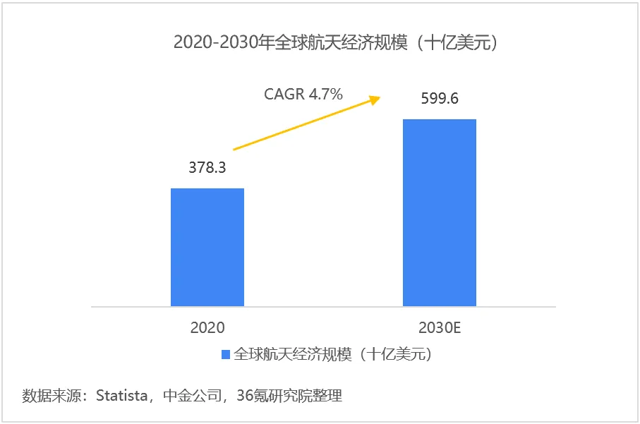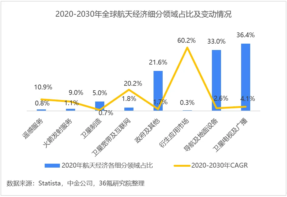 根据Statista预测,2030年全球航天经济规模将达5,996亿美元,2020至2030年航天经济规模CAGR达4.7%。从细分赛道来看,导航及地面设备、卫星电视及广播、政府及其他领域规模当前占比较大,市场竞争较为激烈;而从成长性来看,衍生应用市场、卫星宽带及互联网、遥感服务、火箭发射服务发展空间大,2020-2030年将实现快速增长。