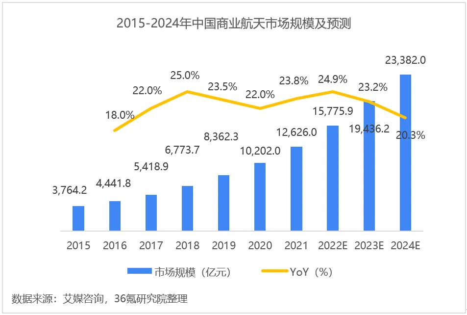 根据艾媒咨询数据,我国商业航天市场规模自2015年以来保持高速增长,2017年至2024年年增长率保持在20%以上,预计2024年商业航天市场规模将达23,382亿元。