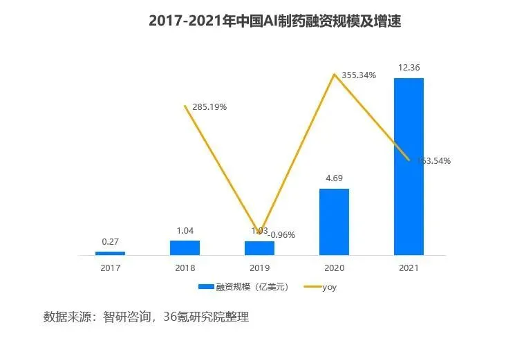 近年来,中国AI药物研发企业融资规模整体向好,但大部分仍处于早期融资阶段。据智研咨询数据,2021年我国AI制药融资规模达12.36亿美元,同比增长163.54%;融资轮次主要集中在天使轮和A轮,B轮及以后占比不足1/3。产品方面,2021年我国AI药物研发实现了从0到1的突破,未知君、冰洲石和英矽智能三家企业研发管线进入到临床一期。但由于技术壁垒等因素限制,目前尚未有AI制药产品上市。