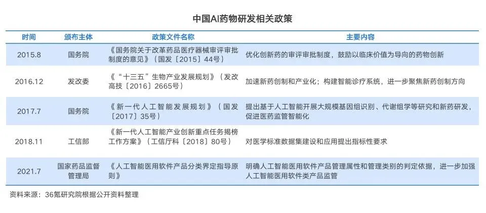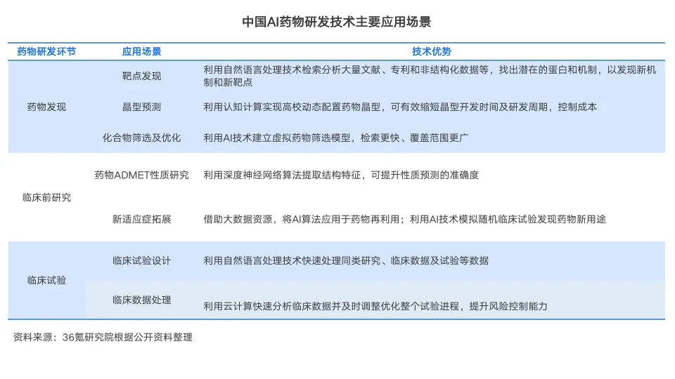 2)技术驱动:研发周期长、成本高、成功率低一直是新药研发领域的痛点。随着机器学习、深度学习、知识图谱等关键技术的快速发展,AI在药物靶点发现、化合物筛选和晶型预测等药物研发环节应用广泛,优势逐渐凸显。例如,在药物发现环节中,AI搜索的深度和广度远超专家经验,数据挖掘和分析有利于创新药物靶点的确定,找到合适的先导化合物,从而提高药物研发效率;在临床前研究环节,基于 AI技术的新药研发管线可将临床前研究时间从3-6年压缩至1-2年,大幅提高效率并节省成本。据TechEmergence研究报告,AI技术可使新药研发成功率由12%上升至14%;此外,CHI HEEM WONG等人的研究数据显示,AI技术可在化合物筛选、合成方面节约40%-50%的时间,每年可为整个制药行业节约260亿美元的成本。