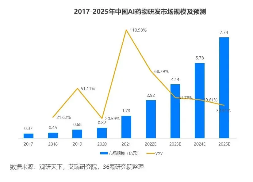 受政策支持、技术发展、市场需求三大利好因素的叠加驱动,短期内我国AI药物研发市场规模会保持较高的增长率,但由于国内大多AI制药企业仍处于投产研发阶段,总体市场规模相对有限。目前,AI驱动管线多处于临床前研究和临床一期阶段,根据新药研发周期,2022-2025年仍处于验证期。虽然短期内可获取的药物研发管线数量不多,但普遍规模较大,随着研发效率的提升以及AI药物研发企业融资进程的加快,未来行业市场规模增速仍然可观。据艾瑞建模测算,2022年中国AI药物研发市场规模为2.92亿元,2025年将达7.74亿元,CAGR为38.39%。