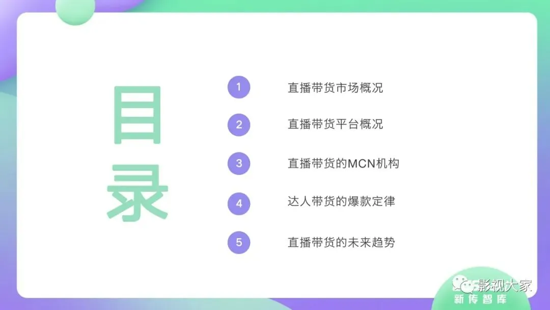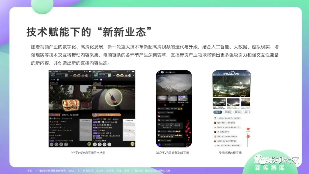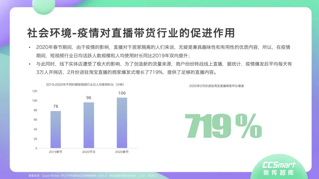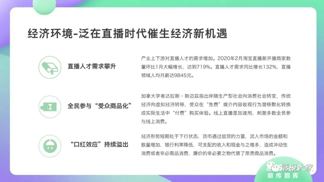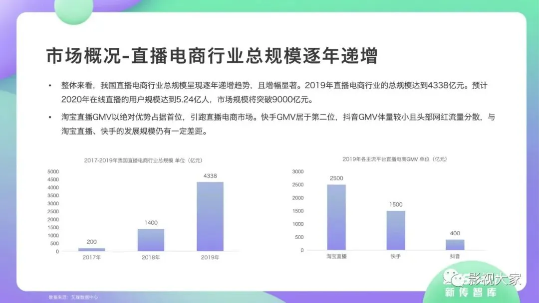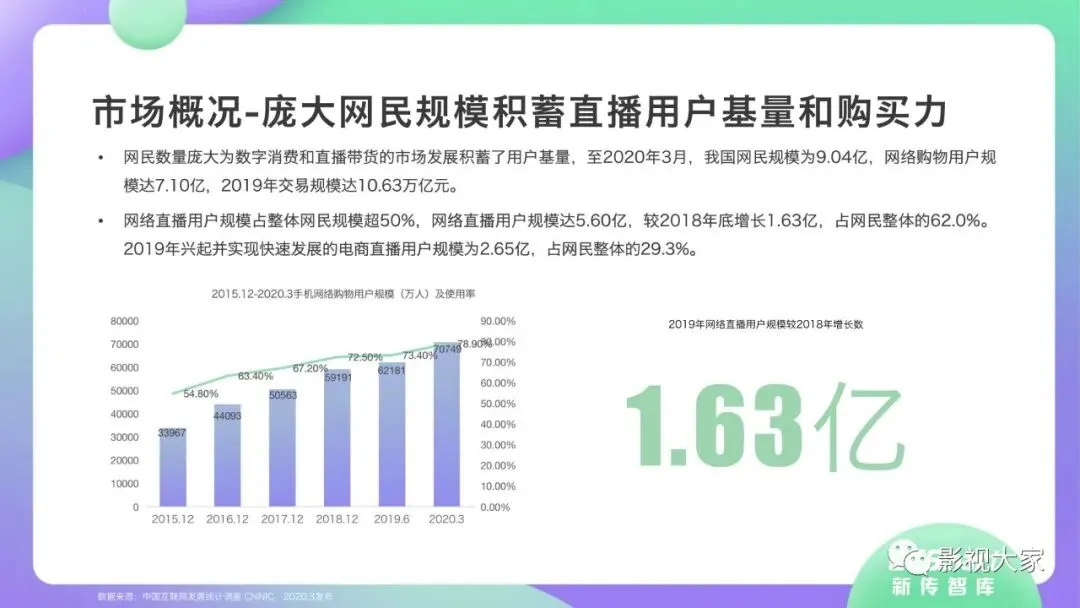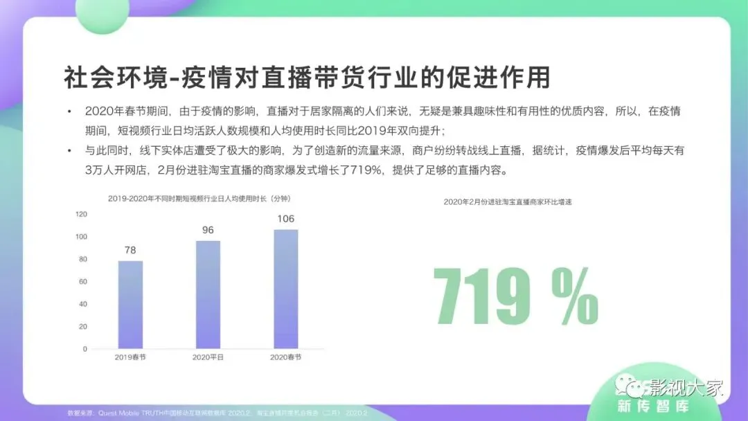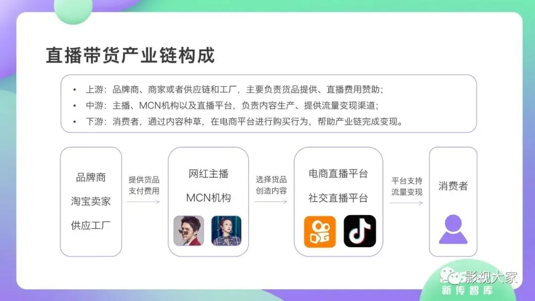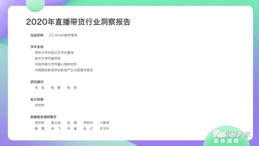 近日,CC-Smart新传智库出品的《2020年直播带货行业洞察报告》重磅发布!本次,CC-Smart新传智库汇聚清华大学、南开大学、中国传媒大学、澳门科技大学等一流高校顶尖专家从研究设计到研究成果制定全流程高端指引。报告整体分为五个部分,涵盖直播带货市场概况、平台概况、MCN机构、达人带货的爆款定律、未来趋势等,纵览直播带货的整体现状,围绕直播带货全产业链进行细分解析。旨在为行业参与主体提供建设性参照,引领相对健康的直播带货生态!本次,《2020年直播带货行业洞察报告》出品方CC-Smart新传智库,聘请清华大学新闻与传播学院副教授、博士生导师司若教授,南开大学传播学系主任陈鹏教授,中国传媒大学新闻学院副教授、中国社会心理学会传播心理专业委员会副秘书长陈锐教授等业内权威专家作为高端顾问,全面指导《2020年直播带货行业洞察报告》的整体研究。作为专注于影视全产业链服务的高端智库平台,新传智库在2016-2019年连续出版影视及文旅蓝皮书系列,并频频获奖!相继推出《中国电视剧发展风向标报告》《中国电视/网络剧产业报告(2020)》《2020中国大学生娱乐形态调研报告》等高质量行业报告,为影视行业风险评估与管控、舆情监测与市场研究提供专业化订制服务,在学界和业界均产生广泛影响力。《2020年直播带货行业洞察报告》采用PEST分析法,从经济环境、政策环境、技术环境、市场环境、社会环境等五个维度宏观梳理直播带货的缘起与“蝶变”。微观注视新冠疫情背景下,全民居家防疫的困境之际,人们排忧解虑的集体选择刺激直播带货体量爆发式增长,“口红效应”持续溢出。实时监测直播带货的热点现象,解析兼具可观赏趣味性和日常有用性的直播带货随之走热的原因。在近几个月研究周期内,新传智库研究团队定量分析直播带货案例,定性分析中外文献及行业文章,汲取“拟剧理论”、“使用与满足理论”、“两极传播理论”、“长尾理论”、“狂欢理论”、“价格感知理论”等覆盖传播学、经济学、文化研究理论精髓,紧扣直播带货行业发展前端,以易于大众接受的话术深入浅出地阐释直播带货高度市场化的多维积淀,前沿展望直播带货的未来走向,匹配泛在读者的需求。