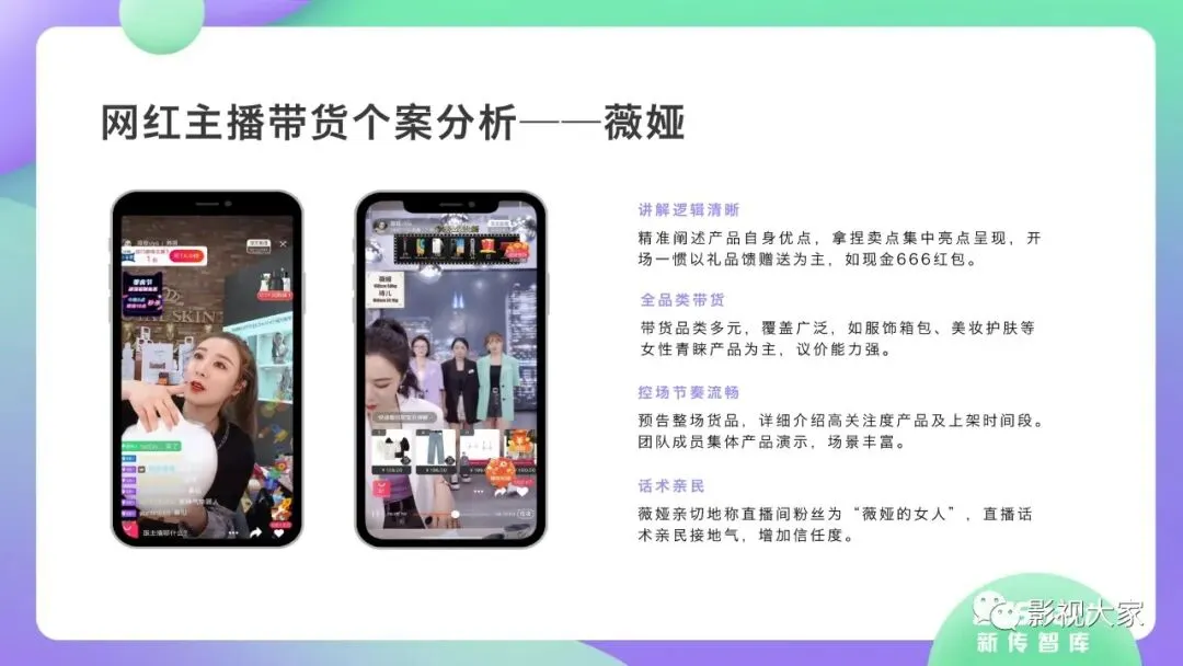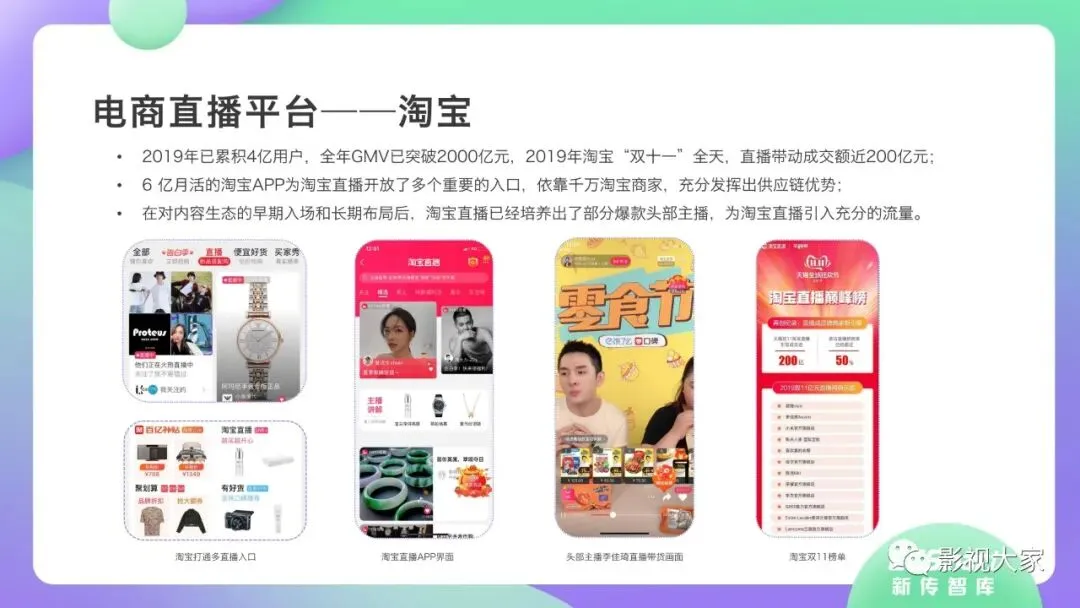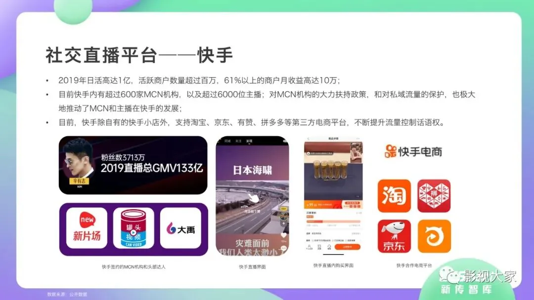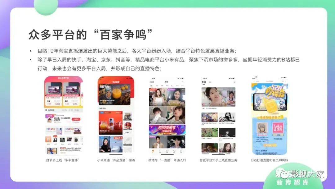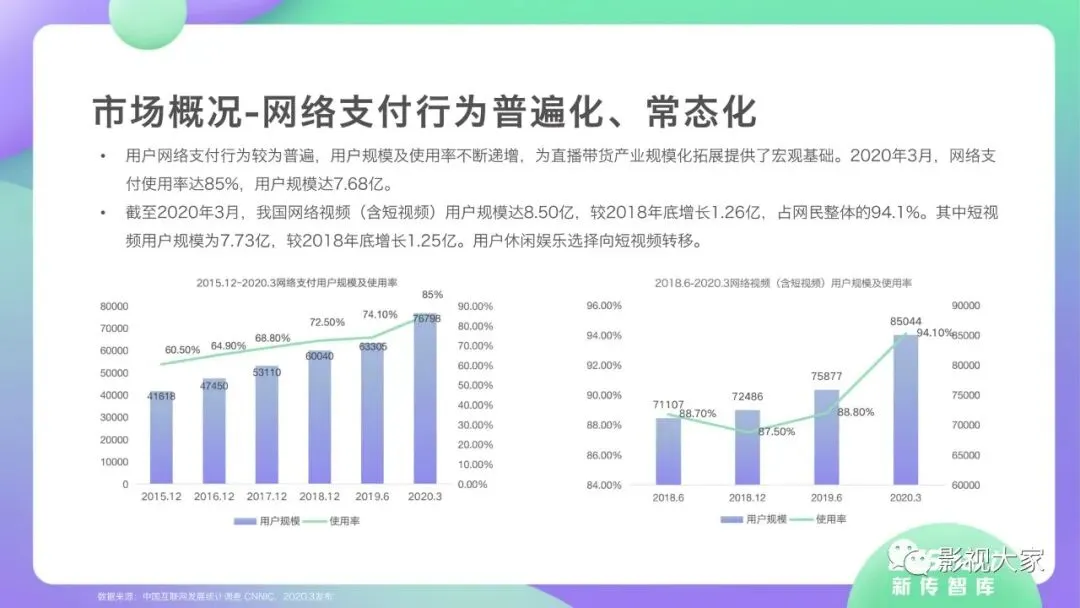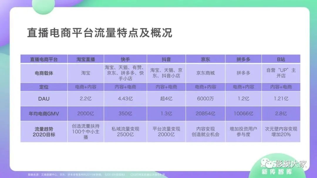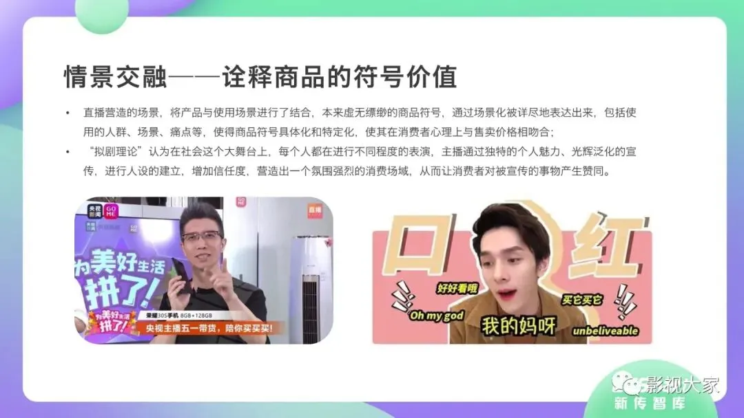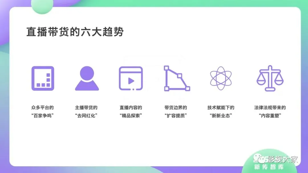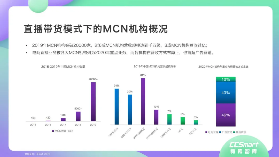 近日,CC-Smart新传智库出品的《2020年直播带货行业洞察报告》重磅发布!本次,CC-Smart新传智库汇聚清华大学、南开大学、中国传媒大学、澳门科技大学等一流高校顶尖专家从研究设计到研究成果制定全流程高端指引。报告整体分为五个部分,涵盖直播带货市场概况、平台概况、MCN机构、达人带货的爆款定律、未来趋势等,纵览直播带货的整体现状,围绕直播带货全产业链进行细分解析。旨在为行业参与主体提供建设性参照,引领相对健康的直播带货生态!本次,《2020年直播带货行业洞察报告》出品方CC-Smart新传智库,聘请清华大学新闻与传播学院副教授、博士生导师司若教授,南开大学传播学系主任陈鹏教授,中国传媒大学新闻学院副教授、中国社会心理学会传播心理专业委员会副秘书长陈锐教授等业内权威专家作为高端顾问,全面指导《2020年直播带货行业洞察报告》的整体研究。作为专注于影视全产业链服务的高端智库平台,新传智库在2016-2019年连续出版影视及文旅蓝皮书系列,并频频获奖!相继推出《中国电视剧发展风向标报告》《中国电视/网络剧产业报告(2020)》《2020中国大学生娱乐形态调研报告》等高质量行业报告,为影视行业风险评估与管控、舆情监测与市场研究提供专业化订制服务,在学界和业界均产生广泛影响力。《2020年直播带货行业洞察报告》采用PEST分析法,从经济环境、政策环境、技术环境、市场环境、社会环境等五个维度宏观梳理直播带货的缘起与“蝶变”。微观注视新冠疫情背景下,全民居家防疫的困境之际,人们排忧解虑的集体选择刺激直播带货体量爆发式增长,“口红效应”持续溢出。实时监测直播带货的热点现象,解析兼具可观赏趣味性和日常有用性的直播带货随之走热的原因。在近几个月研究周期内,新传智库研究团队定量分析直播带货案例,定性分析中外文献及行业文章,汲取“拟剧理论”、“使用与满足理论”、“两极传播理论”、“长尾理论”、“狂欢理论”、“价格感知理论”等覆盖传播学、经济学、文化研究理论精髓,紧扣直播带货行业发展前端,以易于大众接受的话术深入浅出地阐释直播带货高度市场化的多维积淀,前沿展望直播带货的未来走向,匹配泛在读者的需求。