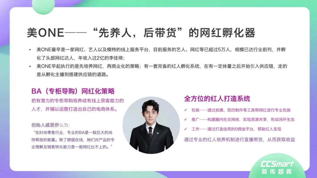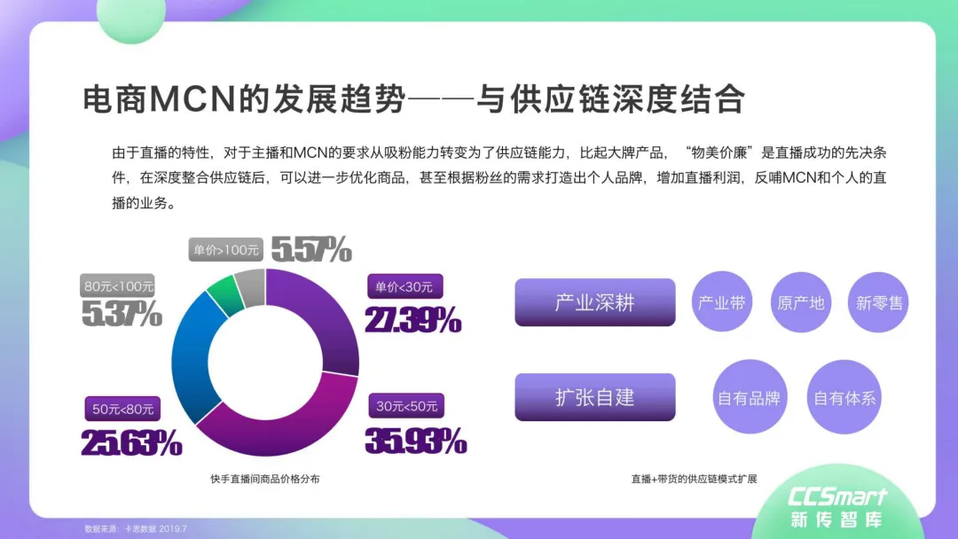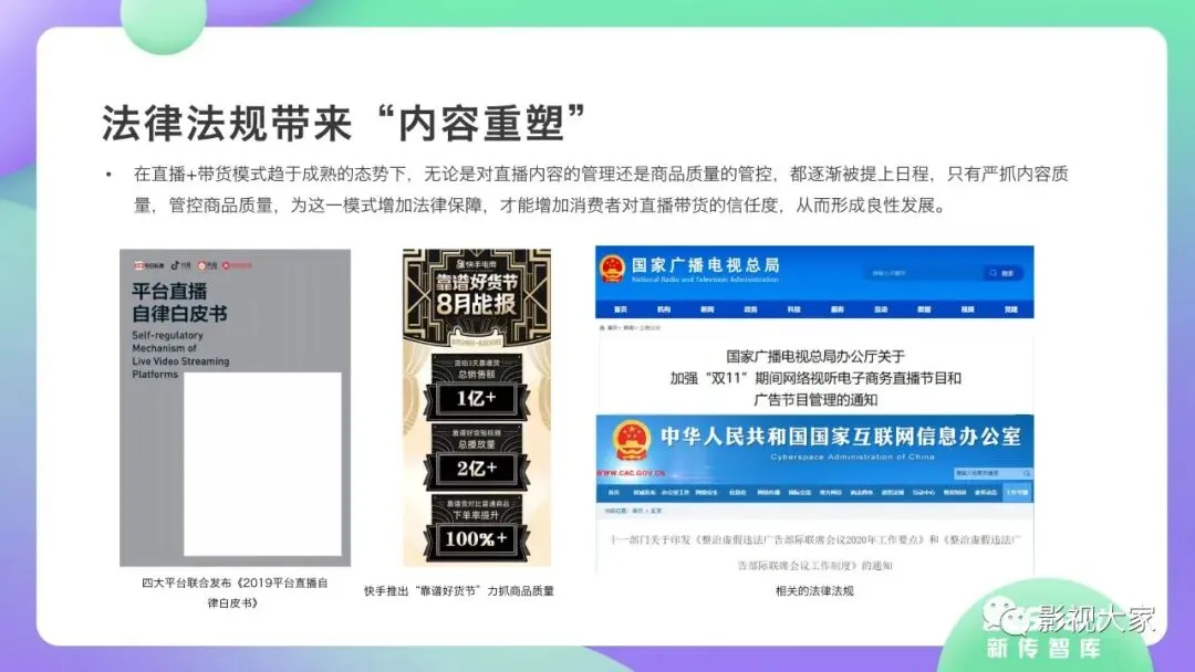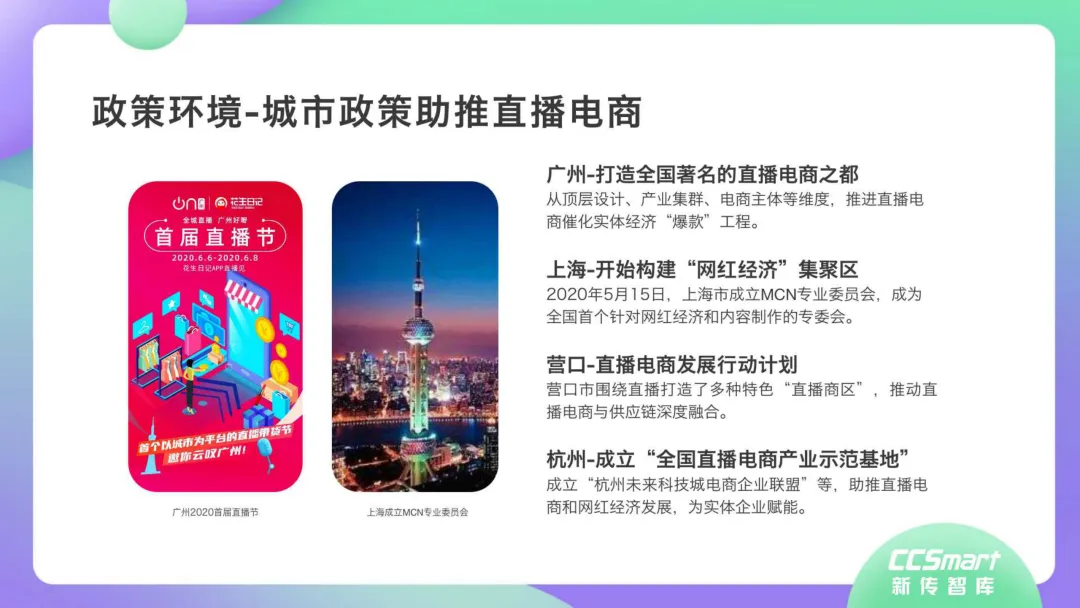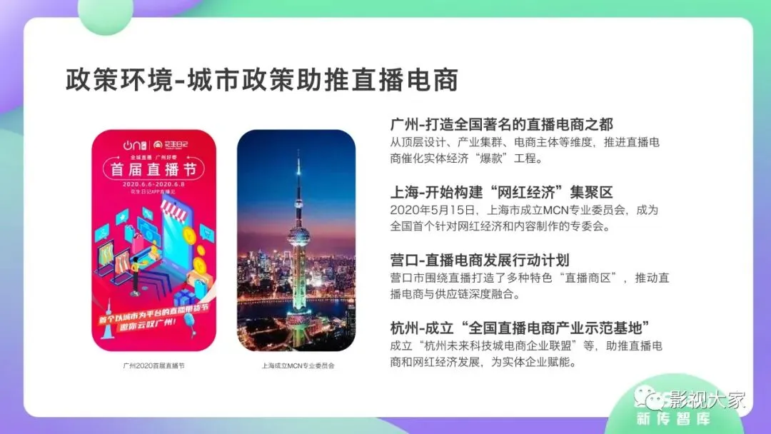 每一个超级网红背后都有MCN机构运营。“口红一哥”李佳琦, 背靠MCN机构美ONE旗下。“淘宝第一女主播”薇娅,由 MCN机构杭州谦寻全力支持。专业MCN机构建构了网红养成流水线的标准化体系,形成网红孵化到供应链搭建的路径,“先养人, 后带货”。签约潜力网红,凭借强大供应链与具备丰富电商经验且成功开拓个人品牌的优质网红产生强绑定关系,批量化培养带货转化率高的网红,建立红人电商矩阵。《2020年直播带货行业洞察报告》一大亮点在于,深度解构情景交融、品效合一、物美价廉、互动娱乐等达人爆款定律和高转化率法则。同时指出,直播带货内容本身需要具备较强的导购属性,这也导致直播内容形式千篇一律,同质化弊端显露。随着直播规模进一步扩大,用户会更趋向于优质内容的常态化消费。因此,相关监管部门将强化品控,同时也制定了城市政策,如广州打造“直播电商之都”,上海建设“网红经济集聚区”,浙江实施“村播计划”等,促进以城市为执行主体的直播电商和网红经济全产业链发展。
