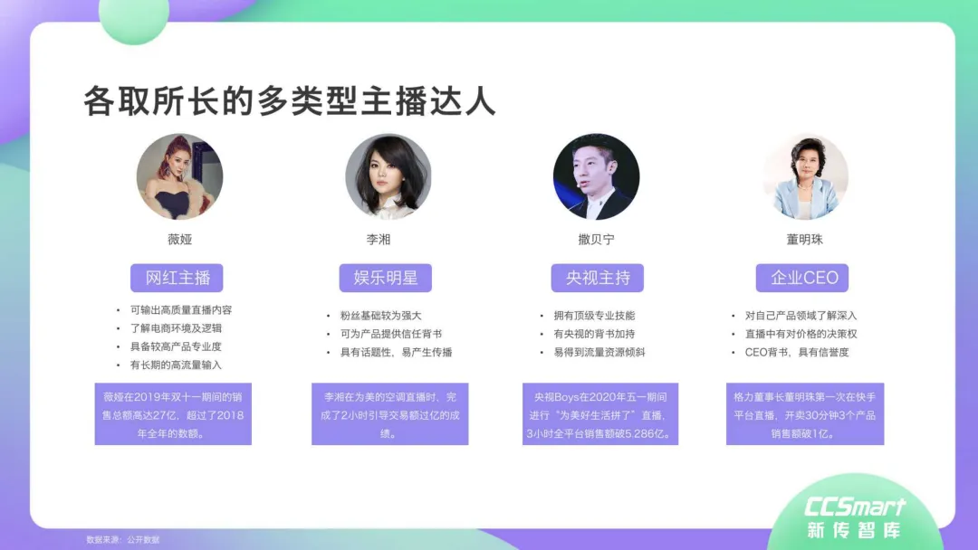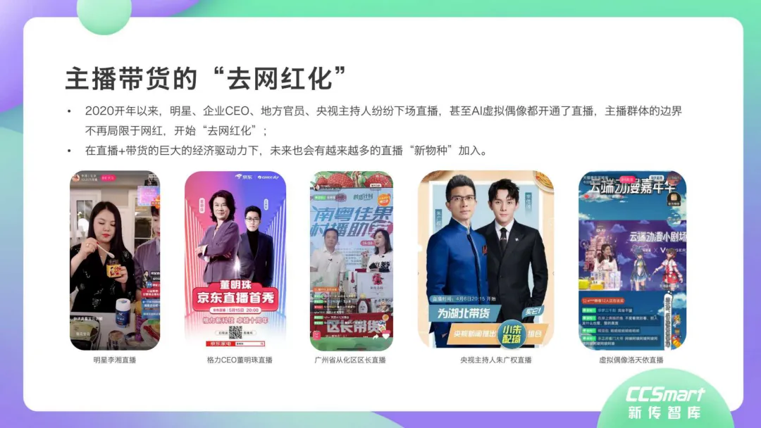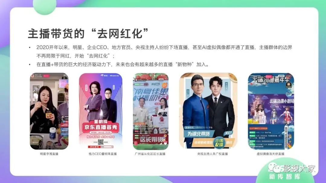 虽然现象级超级主播数量处于断层状态,但多梯队主播入局直播带货风口正盛。目前参与直播带货的主播群体并不局限于MCN机构的网红达人,传统媒体主持人、政府官员、企业CEO、明星、零售店主,甚至是三五线下沉的小镇青年或具备独特手艺的非遗传承人,以及虚拟偶像都加入直播带货行列,“去网红化”效应初显。未来,随着直播带货垂直赋能美妆、美食、瘦身、旅行、汽车、零售、教育、科技、脱贫扶贫、助商助农、政务传播等行业,其培植创效的价值边界亦被极大拓展。
