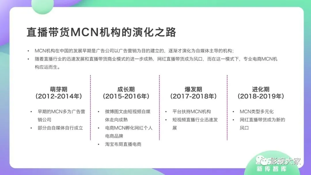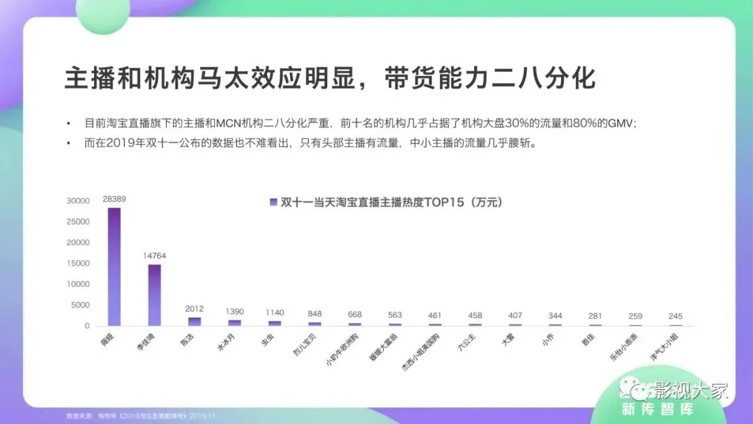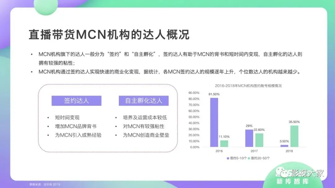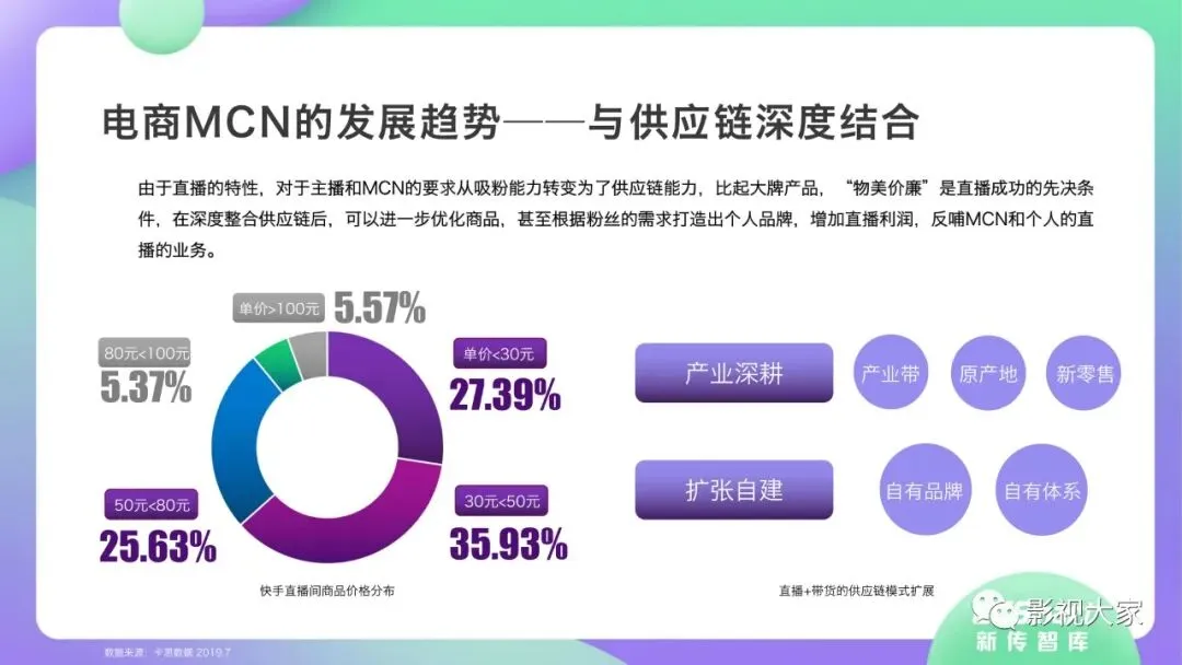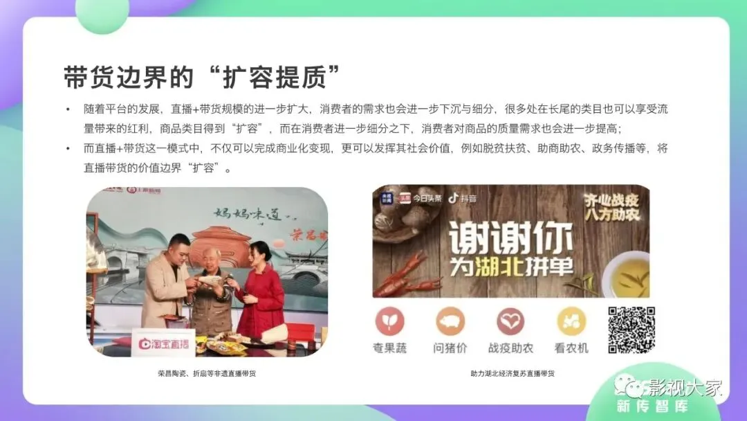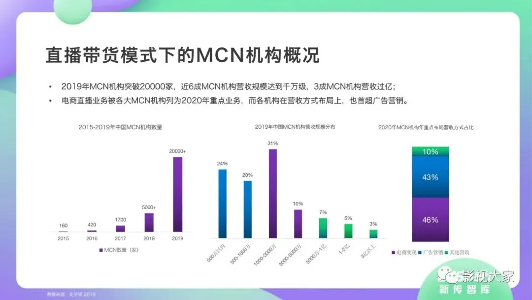 随着多平台机构入局直播带货,带货效应二八分化。疫情过后,一方面直播带货平台或MCN机构或将加速梯队分化,头部引领,腰部强化中坚力量,中长尾机构面临生存风险。随着优质平台核心壁垒的稳定锻造,盈利拐点已经出现,劣势劣质平台将被市场驱逐。另一方面,资本力量介入,或将加速直播带货平台机构的横纵向整合及兼并重组,形成差异化、规范化、效应化集聚。从MCN走向看,内容变现拓展、品牌全案营销、多元盈利模式开辟、柔性供应链自给供应、前端高效驱动后端等成为MCN机构未发展的核心着力点,而直播带货是MCN机构发展的重要方向。《2020年直播带货行业洞察报告》完整版已经在相关主流媒体平台、公众号“影视大家”、“全球文旅观察”、“影视产业观察”、“看电视”等全面发布!如需获取,敬请关注相关公众号或联系微信号:sx15510335285。附报告全文