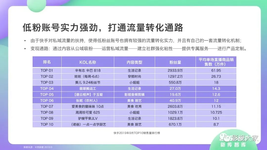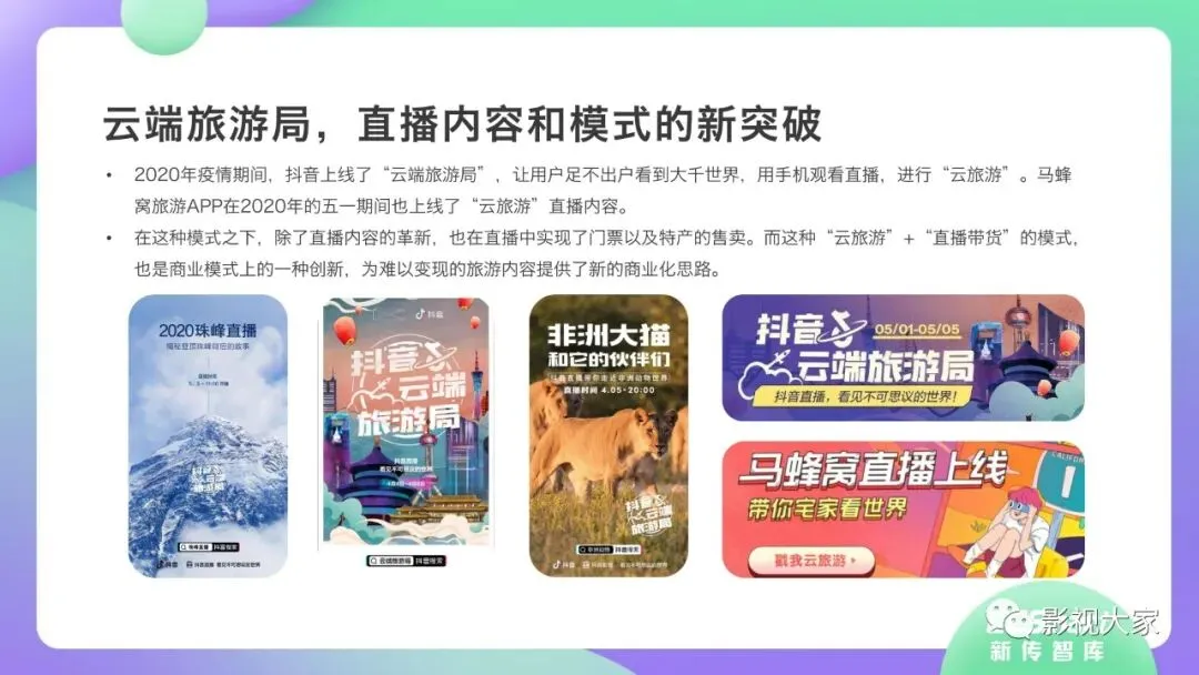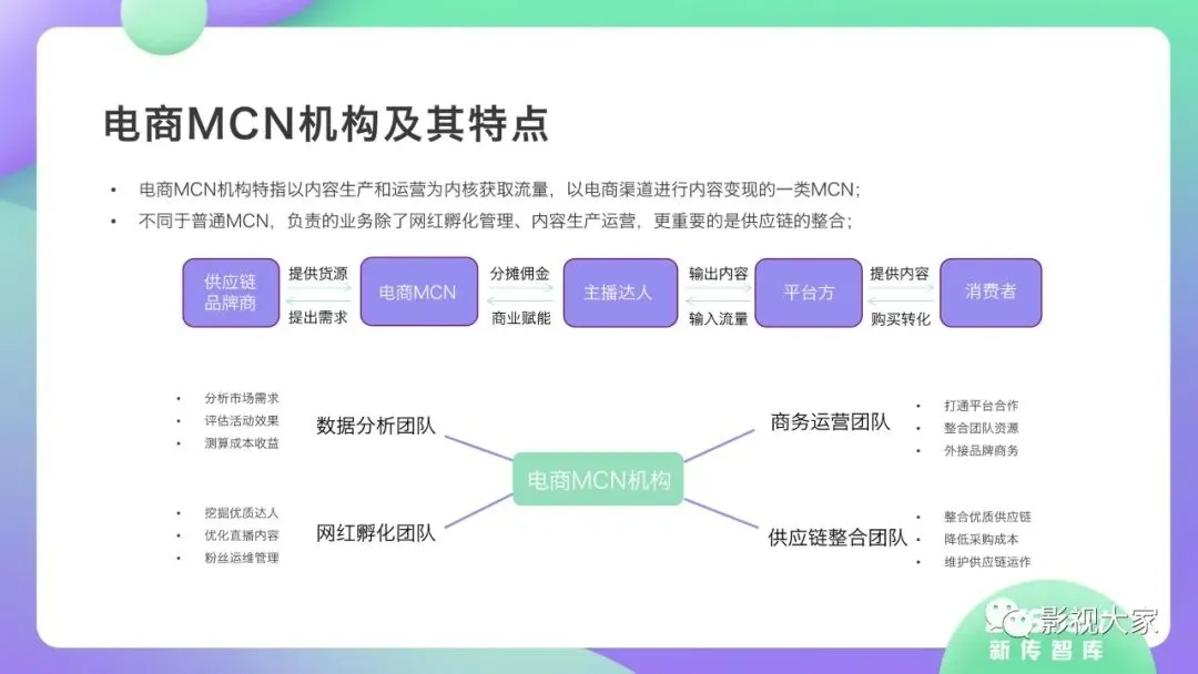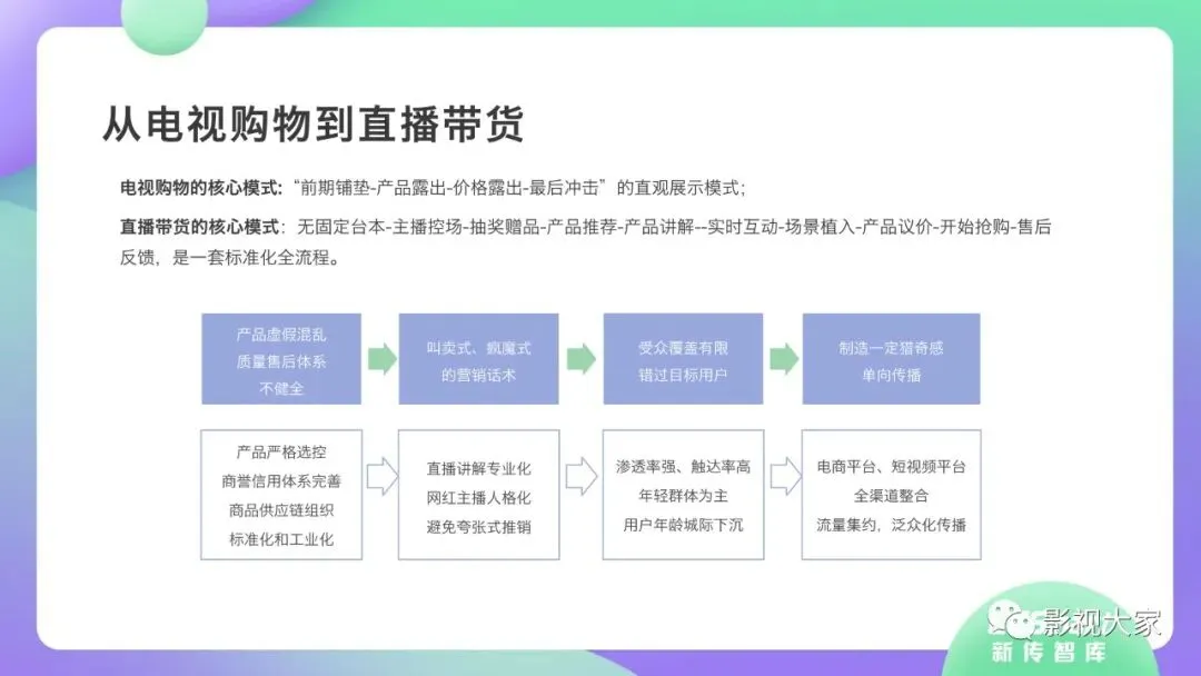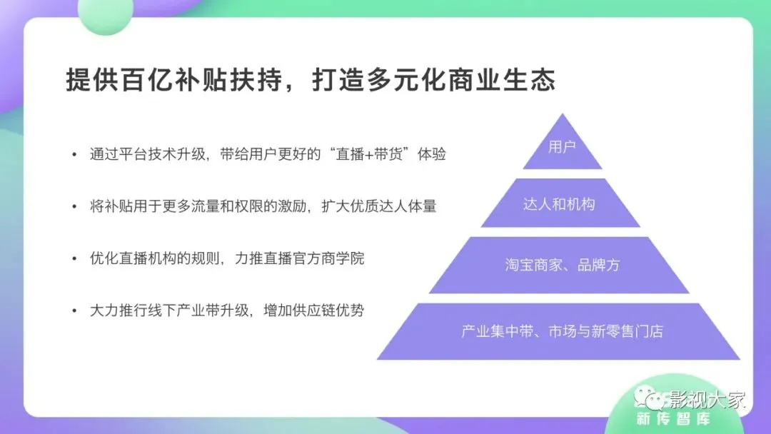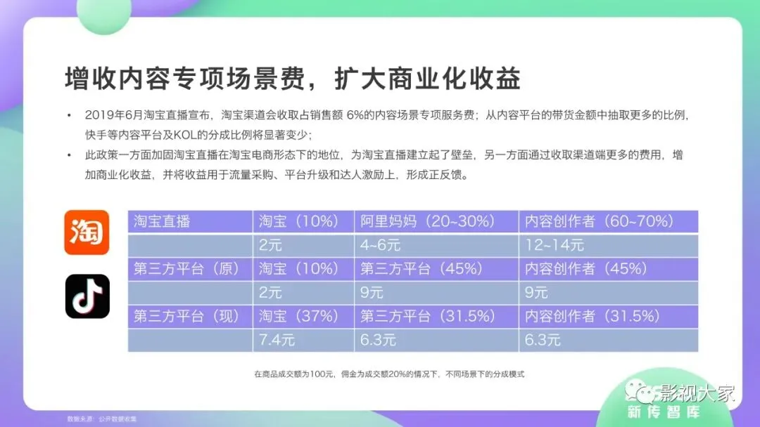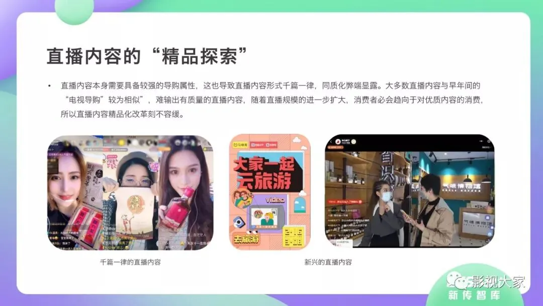 随着多平台机构入局直播带货,带货效应二八分化。疫情过后,一方面直播带货平台或MCN机构或将加速梯队分化,头部引领,腰部强化中坚力量,中长尾机构面临生存风险。随着优质平台核心壁垒的稳定锻造,盈利拐点已经出现,劣势劣质平台将被市场驱逐。另一方面,资本力量介入,或将加速直播带货平台机构的横纵向整合及兼并重组,形成差异化、规范化、效应化集聚。从MCN走向看,内容变现拓展、品牌全案营销、多元盈利模式开辟、柔性供应链自给供应、前端高效驱动后端等成为MCN机构未发展的核心着力点,而直播带货是MCN机构发展的重要方向。《2020年直播带货行业洞察报告》完整版已经在相关主流媒体平台、公众号“影视大家”、“全球文旅观察”、“影视产业观察”、“看电视”等全面发布!如需获取,敬请关注相关公众号或联系微信号:sx15510335285。附报告全文