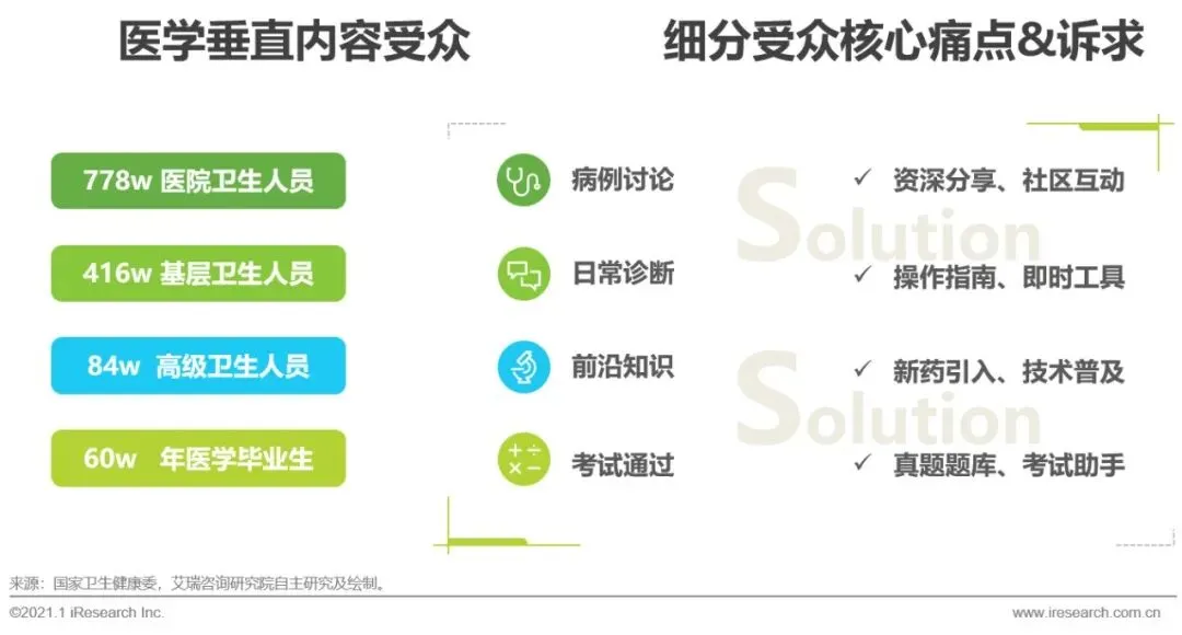 对于医学生来说,第一需求为考试的通过率,这是医学垂直内容的第一入口,医学生中50%-60%未来会成为医生继续作为内容受众。另外,针对基层医生和专业医生,理论知识难以与实际相结合,一方面需要大量的病例讨论,可以通过资深医生的总结和社区性的互动交流解决;第二方面是操作指南,它的价值是医生保护伞,用于即时医疗、诊断质量、安全性等;第三方面是新药、新技术的普及,对于资深级别的医生具有较高的价值。