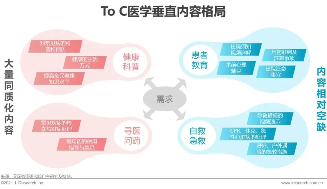 互联网医学内容针对大众消费者端主要覆盖健康科普、寻医问药、患者教育和急救自救知识等领域。早期,大量“互联网+“医疗平台通过布局健康科普内容而切入行业,目前相关领域已成红海,存在大量同质化内容与服务。而患者教育和自救及急救知识领域则相对空白,相关领域知识的创作与推广成为互联网医疗的新方向。通过术前科普视频、术后注意及出院准则视频像患者详细解答病患常见问题,解决因专家门诊时间有限,而患者想要知道病情的来龙去脉所产生的矛盾。急救自救内容针对专业医疗人员介入前的数分钟空白时间,能让患者即学即用,及时采取应急处理。
