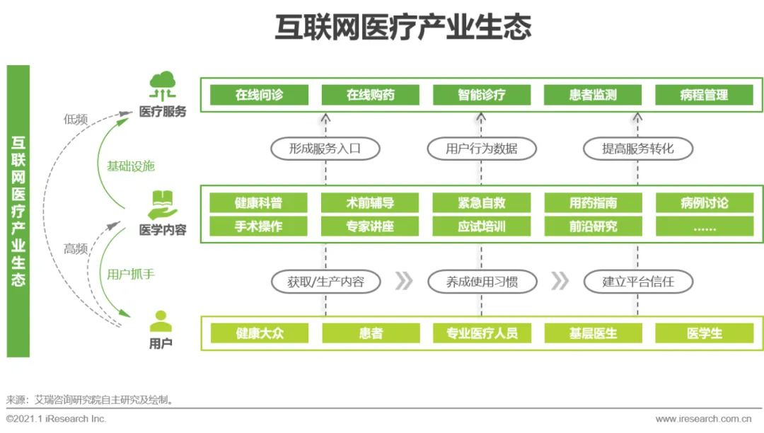 随着近年来移动互联网技术的创新以及今年新冠疫情的驱动,数字化医疗加速发展,医学内容平台作为医生和患者日常学习及交流的平台,成为了互联网医疗产业生态链上最有力的用户抓手。一方面,医学内容平台通过用户对内容的高频使用习惯将用户沉淀在平台上,便可形成相对低频的医疗服务的天然入口。另一方面,平台在用户使用过程中能够收集积累大量的用户行为数据,这些数据能够用于进一步优化内容推送的精准性,提升数字化营销与电商转化的效果。同时,平台通过医学内容的专业性建立用户信任,也能够帮助用户跨越对医疗服务的信任门槛。