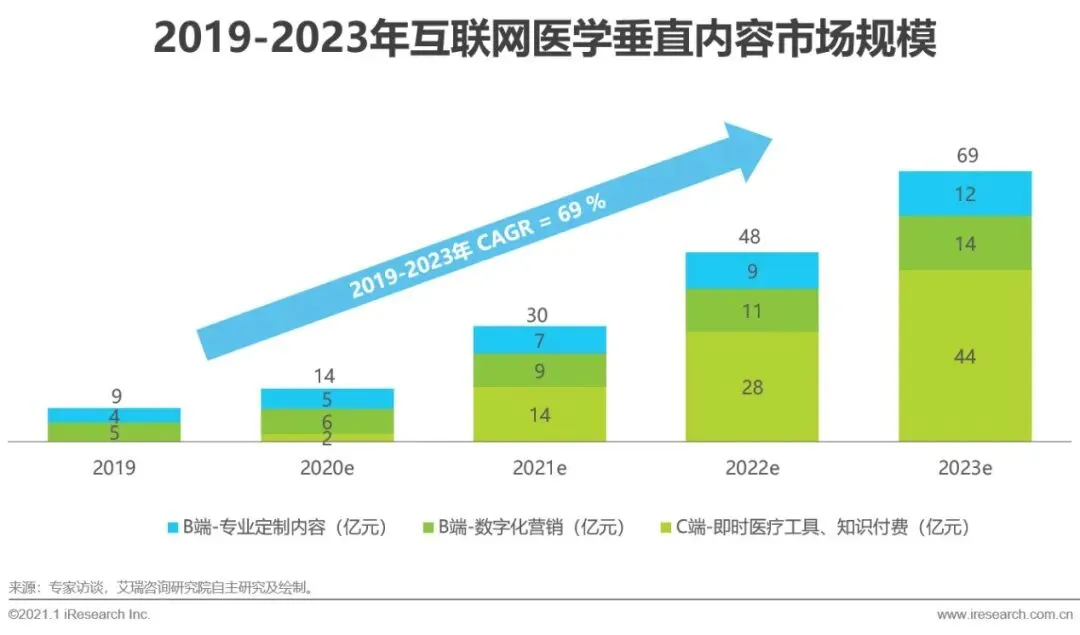 目前互联网医学垂直内容市场规模主要来自于B端业务收入(专业定制医学内容、药企数字化营销),C端知识付费等收入处于商业变现成长期,占比低于1%。随着图像识别技术、AI诊断的日臻成熟,工具类医学内容将成为粘性、壁垒更高的载体形式,整体互联网医学垂直内容市场藉此将实现爆发式增长,艾瑞咨询预计2023年市场规模将达到69亿元。其中,C端收入占比预计将于2022年超过B端业务,于2023年突破60%,进入商业变现成熟期。