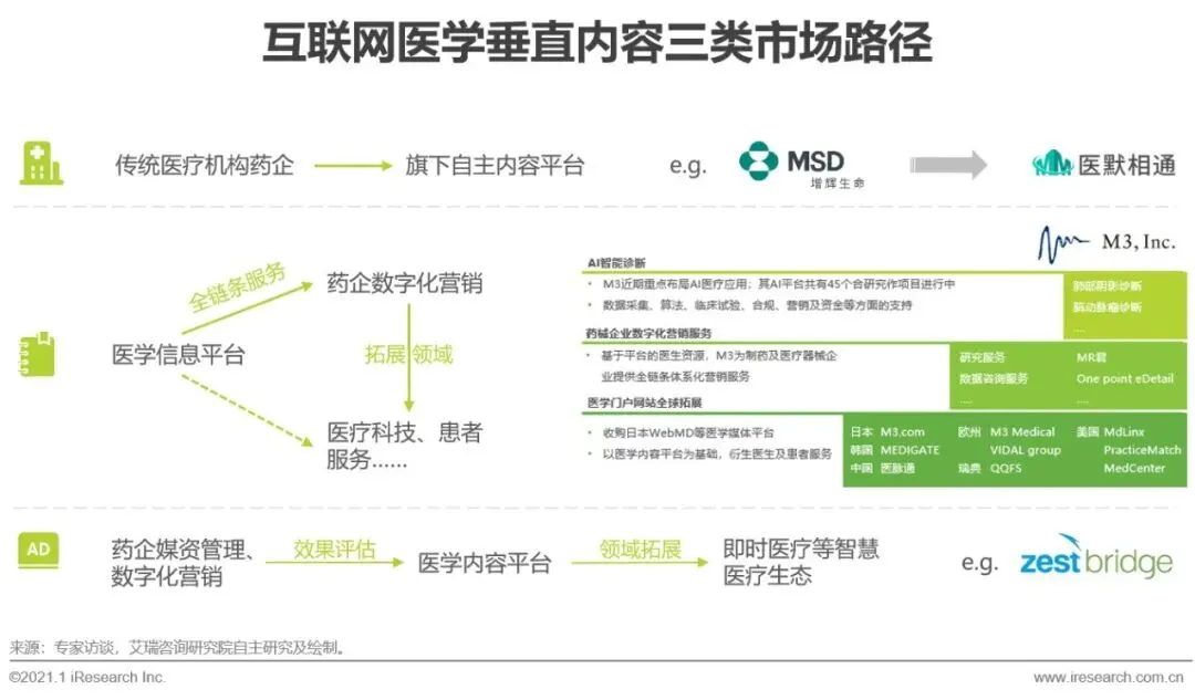 当前互联网医学垂直内容的生产路径主要来自于传统医疗机构与第三方平台。一方面,数据和数字化日益成为大多数跨国药企的战略重点,除商业数据中心外,医学内容中心的必要性凸显,用以支持医学、销售与市场、准入、传播等部门未来和客户信息交换的需求。另一方面,M3 Inc.与梅斯医学等海内外第三方内容平台逐渐发掘出医学垂直内容的深层价值,泽桥传媒等药企数字营销平台也迅速进行转型,基于广告投放的效果评估优势切入医学垂直内容领域。两者殊途同归,在医学垂直内容平台的资源基础上,结合AI等科技手段,进一步探索衍生医生及患者服务,切入即时医疗等智慧医疗生态。