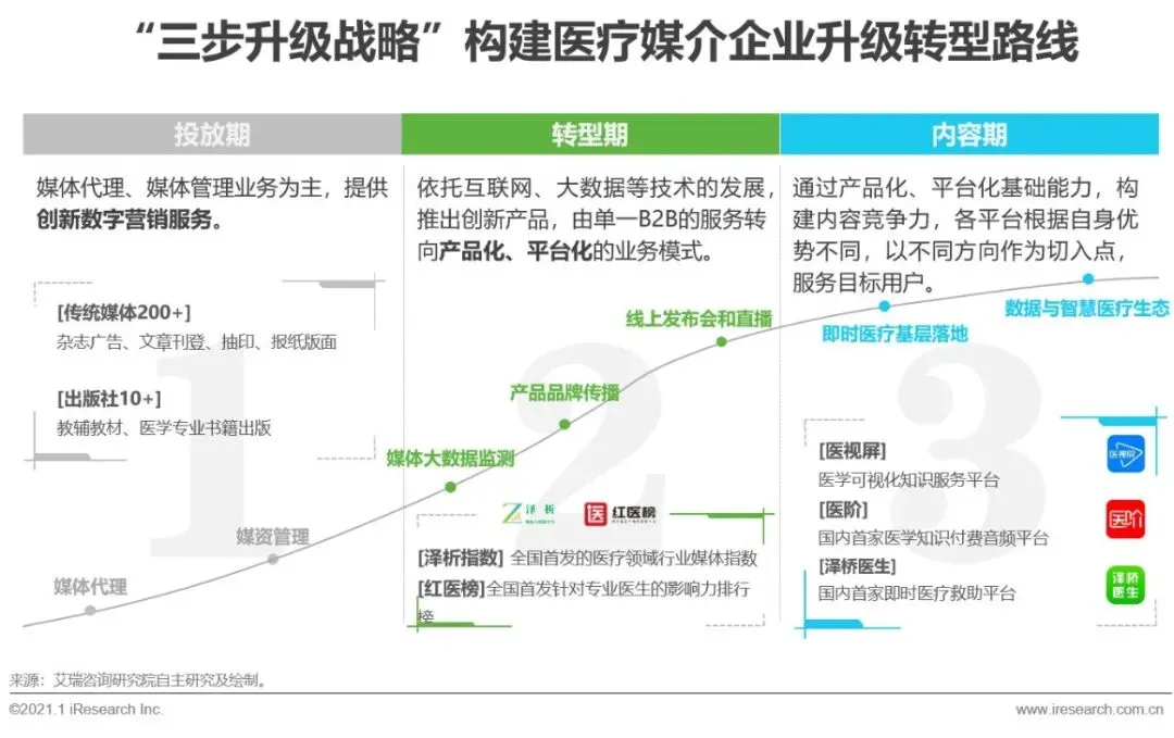 泽桥传媒依靠三步升级战略构建医疗媒体企业转型路径。以投放期的数字营销服务与医疗资源为基础,转型期依托互联网、大数据等技术,由单一B2B的服务转向数据监测、效果评估等产品化、平台化的业务模式。泽桥传媒将内容作为中长期战略规划,通过差异化内容驱动、科技赋能,切入即时医疗,构建智慧医疗生态。
