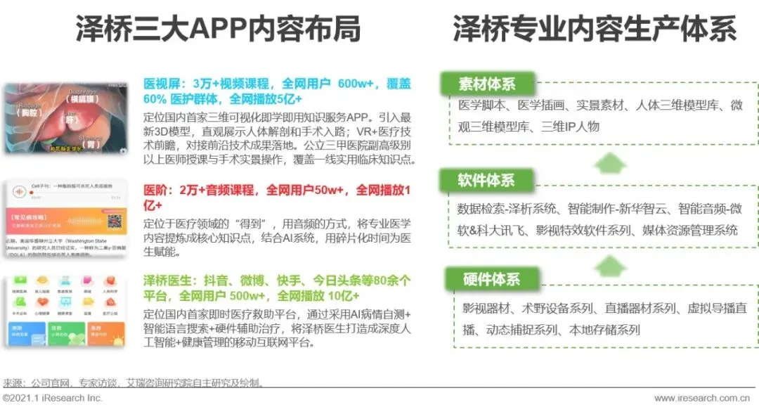 泽桥目前正处于从营销投放到专业医学内容平台的转型中后期,一方面其凭借创新营销方面的深耕优势提供各类医学服务和投放监测产品,另一方面积极布局音频视频产品线,不断开发完善内容体系。目前整体上形成了“医疗健康板块+营销服务板块”的业务布局。在营销服务板块,泽桥通过聚焦医学行业,提供包括监测企业的媒体投放量、协助产品品牌传播、举办健康论坛等服务。经历了2019年内容年,2020年推广年之后,营销服务板块将在2021年进入品牌年,围绕媒资管理和统采业务,进一步优化结构,加速B段合作的全面线上化进程,实现稳定流水增长。